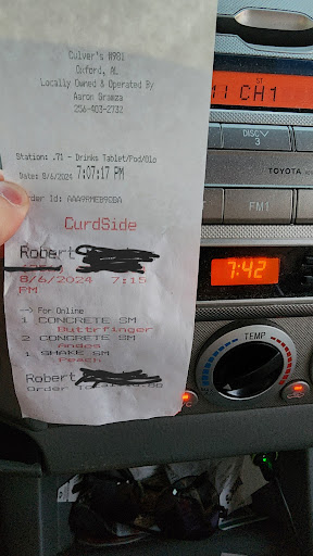 Read moreThis was our second visit since this location opened. Since it is so new, they stay busy in Oxford, AL. Both times, they had employees in the parking lot assisting their customers, such as directing them on empty spots, stopping the incoming customers so that the ones leaving could back out of the spot, etc. On this visit, the male employee suggested that we back into the spot to make it easier to exit, which is an awesome idea. Also, he gave good directions on the best way to back in and would stop or hold the incoming customers until the one(s) parking was in a spot. After placing our order, we got our drinks and realized that there were no straws. So, I asked a female employee if she was the one who was keeping these types of items stocked. She explained that she was not but asked me how she could help. So, I explained, and she solved that issue immediately. Both dine in, and the drive-thru were really busy. During this visit; I saw employees taking food outside and the same employees delivering food to those inside, as well. We ordered two of the 2pc fish dinners and one chicken sandwich basket. The food was hot, good, and to our table in a reasonable amount of time, based on how busy they were. Culver's is a bit pricey, but that is the norm nowadays. Overall, both of our visits to Oxford Culver's...