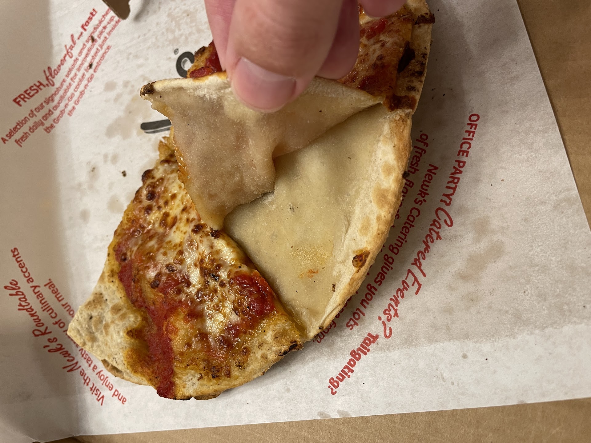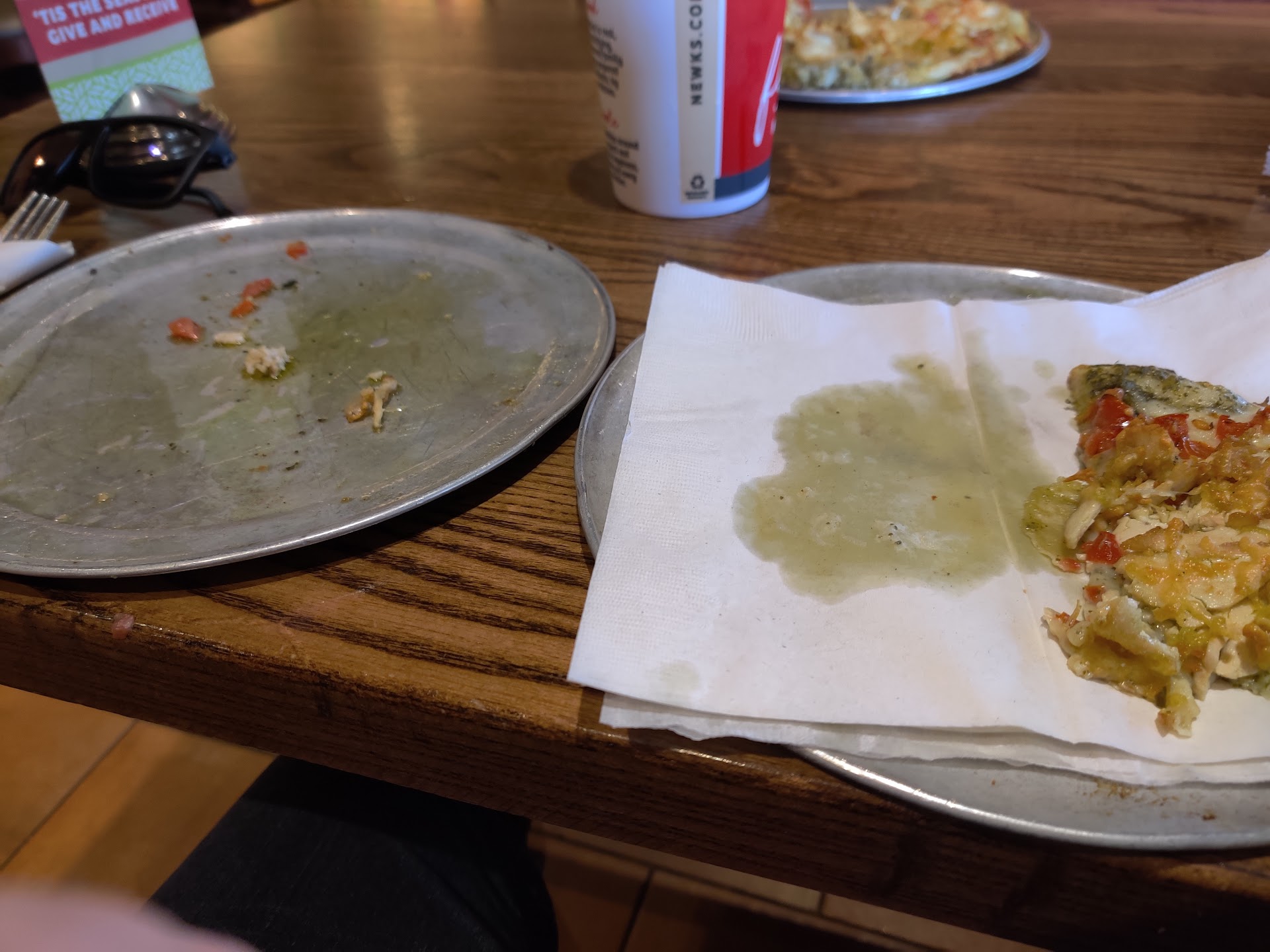 They needed to remake their pesto sauce or just mix it back up. Either way, the didn't do that. I can tell you the crust is premade from the freezer. So I can't imagine they make their pizza sauces there. Which is almost worse because that means they just didn't mix it up before remaking it.
