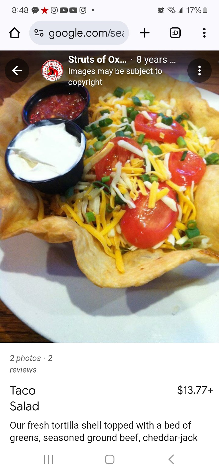 Read moreI had been craving a taco salad in the edible shell for ages. I found it on Strut's menu along with a photo on their website. I sent my husband to pick one up for me tonight, and my excitement turned disappointment and disgusting when he got home with it. The first photo is from Struts website, and the second photo is what I got - a plate of STALE nacho chips with a little bit of lettuce in huge pieces, with ice cold ground beef! Nothing at all like the description on the menu. Don't give me " the shell won't fit into the Styrofoam plate!" Then get some carry-out containers it WILL fit into, or notate on your menu that carry-out orders will be prepared differently. If I had known this was what I was going to get, I would've ordered from somewhere else!! SO DISAPPOINTED IN...