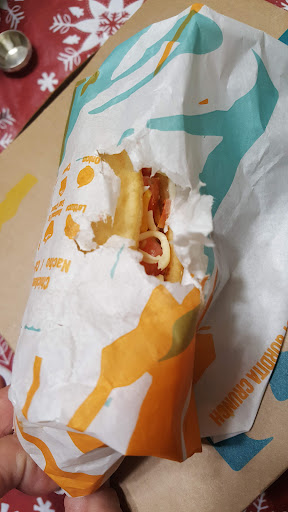 Read moreI understand that the inside was closed. I would normally go inside for a large order. I had to go to the drive-thru and ordered six box combos intending for them to go to three separate houses. The cashier was extremely friendly but all six orders were shoved into one bag. I had to touch everybody's food twice and order to separate it from each household. Everything on the bottom is squished. It would have been more convenient had the orders been put in actual boxes or at least separate bags indicating one person's meal from the others 12/22/22. Again, I ordered 4 boxes and all the food was shoveled into one bag. All the chips fell out of the bags and I didn't have time to separate everyone's order before I had to go back into work. I grabbed a soft taco and sent the rest home for them to sort out and redistribute the chips. Seriously! If you run out of boxes, atleast bag the meals separately! I give up on taco bell. They are always out of the things I like and put as much stuff into one bag as possible. If the food is meant to look squished and loose in the bag, then congratulations, but I prefer mine to be...