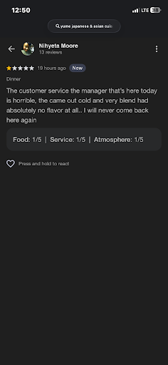 Read moreReplying to this review since she doesn’t want to give full story. This lady had no money to eat, she gave her server 2 cards first one was expired then second one declined, server was instructed to hold her food in the kitchen. Customer then said she was sent money to eat, her server brought her food out and after eating her spring rolls, complained that her rice had no egg, she was offered for her rice to be recooked or eggs to be brought out to her, seemed like that wasn’t what she wanted, then said her food was cold, (after her food was held in the kitchen for not having money) she was offered for her entire plate to be recooked, then said her ribeye was not med well, when she was asked to simply just cut a piece open she was throwing it onto the plate not letting anybody see her ribeye, she was once again offered for her plate to be recooked, when confirming how her ribeye was suppose to be cooked “your ribeye suppose to be med well right?” Her reply was “that’s what i said Girl” after taking her plate and asking the kitchen to recook her meal she told the server that she only wanted to pay for what she touched at which point is fine, she had already caused enough stress to the staff, guessing she didn’t even have $5 to pay for spring rolls because she left without even...