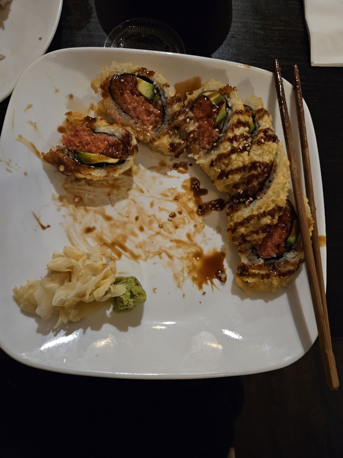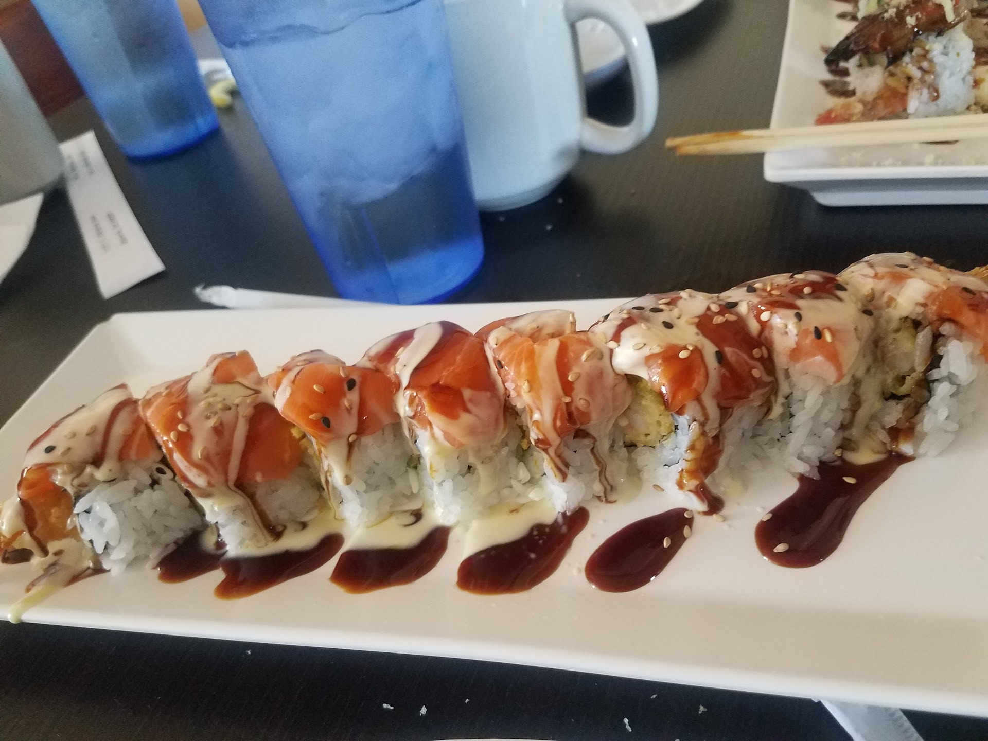 Read moreWe made it in by lunch time on a Saturday so my mom and aunt were able to order a lunch Bento plate. They both got their usual which is Salmon teriyaki. We've never been here before so I had to check online and make sure they served Salmon Terriyaki. Let me tell you.. Their bento is what earned them the 4 stars. It was a big portion for being lunch but a lot of food is always appreciated with us Asian folks. The mixed tempura it came with was impressive and my mom and aunt both said the salmon was very good. They were very happy. Too bad I forgot to take a picture of that Bento plate lol. Me and my daughter both got special rolls. Mine was the Crouching Tiger Hidden Dragon roll and it just had an absurd amount of crunch flakes. But brushing aside most of it, the flavor was still good. My daughter had the Dinosaur roll and hers wasn't drowned in any crunch flakes so it was pretty and yummy. She also got a tuna sushi nigiri which came out very red and looking fresh. She said it was good. We also shared the salmon lover roll which was good and got gobbled up quickly. Last but not least, to add to my high cholesterol... I ordered the heart attack because stuffed jalapeños with spicy tuna is my weakness. It was delicious and even my kid who can't eat spicy was able to actually eat a piece. The first time she's ever eaten a jalapeño in her life. That was a joy to witness. Maybe the only reason why I didn't give 5 stars was because how our waitress made me feel. She never smiled and I felt rushed trying to order drinks with her. I just didn't feel welcomed with her. So that's the reason for 4 instead of 5. Otherwise, we'll be back... I was kind of tired of driving all the way to Kabukis just so my mom can order Salmon Terriyaki so...