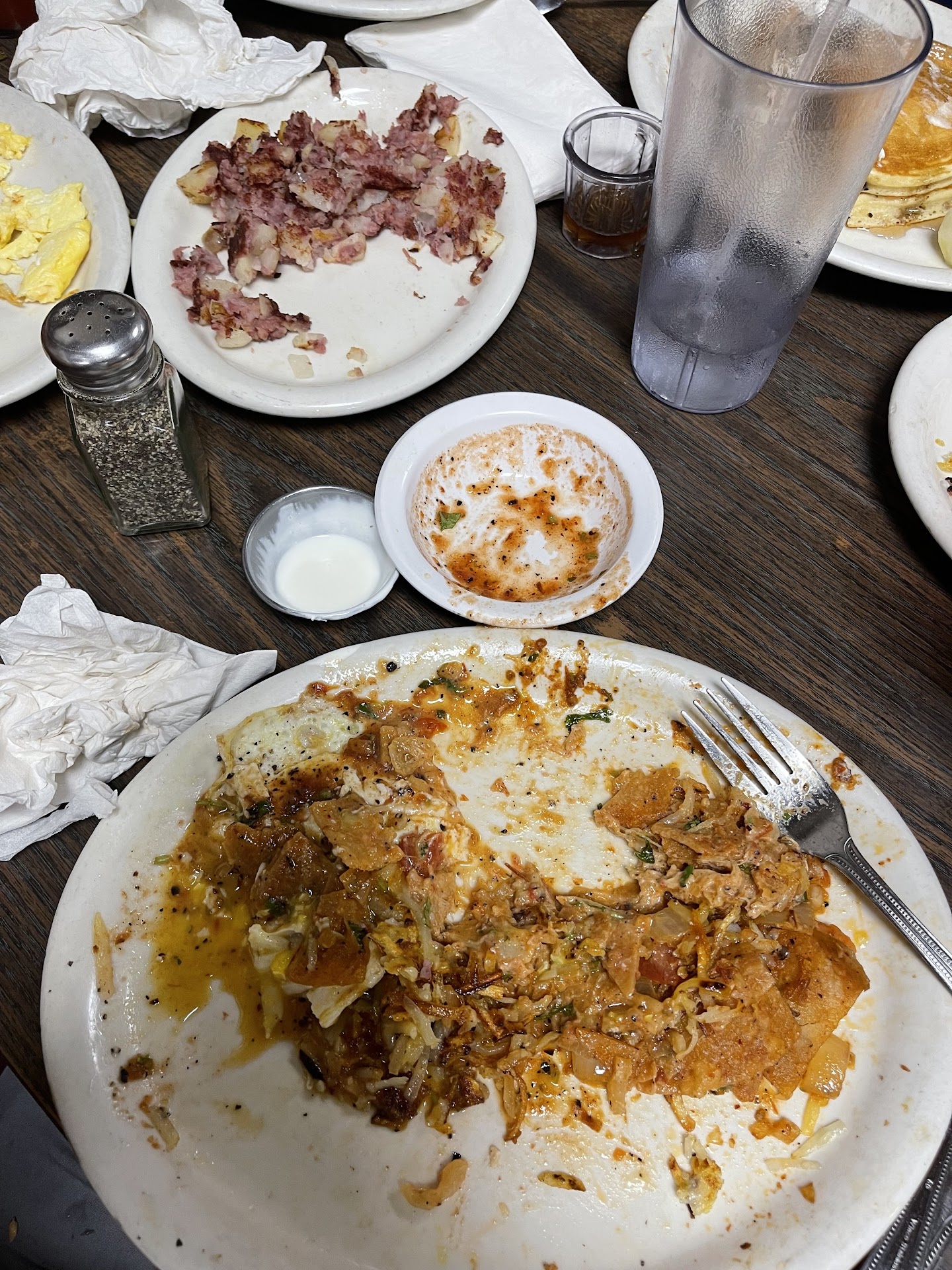 Chilaquiles and Eggs ($8.50) is crispy tortilla strips tossed with onion and tomato, topped with red salsa and cheese, served with sour cream and your choice of either home fries, hash browns, refried beans, sliced tomatoes, cottage cheese, or fresh fruit. It also comes with your choice of toast, English muffin, buttermilk biscuit, or tortillas. These are one of the best chilaquiles you'll ever have. Since they use their award-winning salsa, the tortilla strips absorb the flavors of the tomatoes, onions, and spices. It has a slightly spicy kick but is not overwhelming. The sour cream adds a creamy cooling quality to finish it off. Rating: 4.5/5