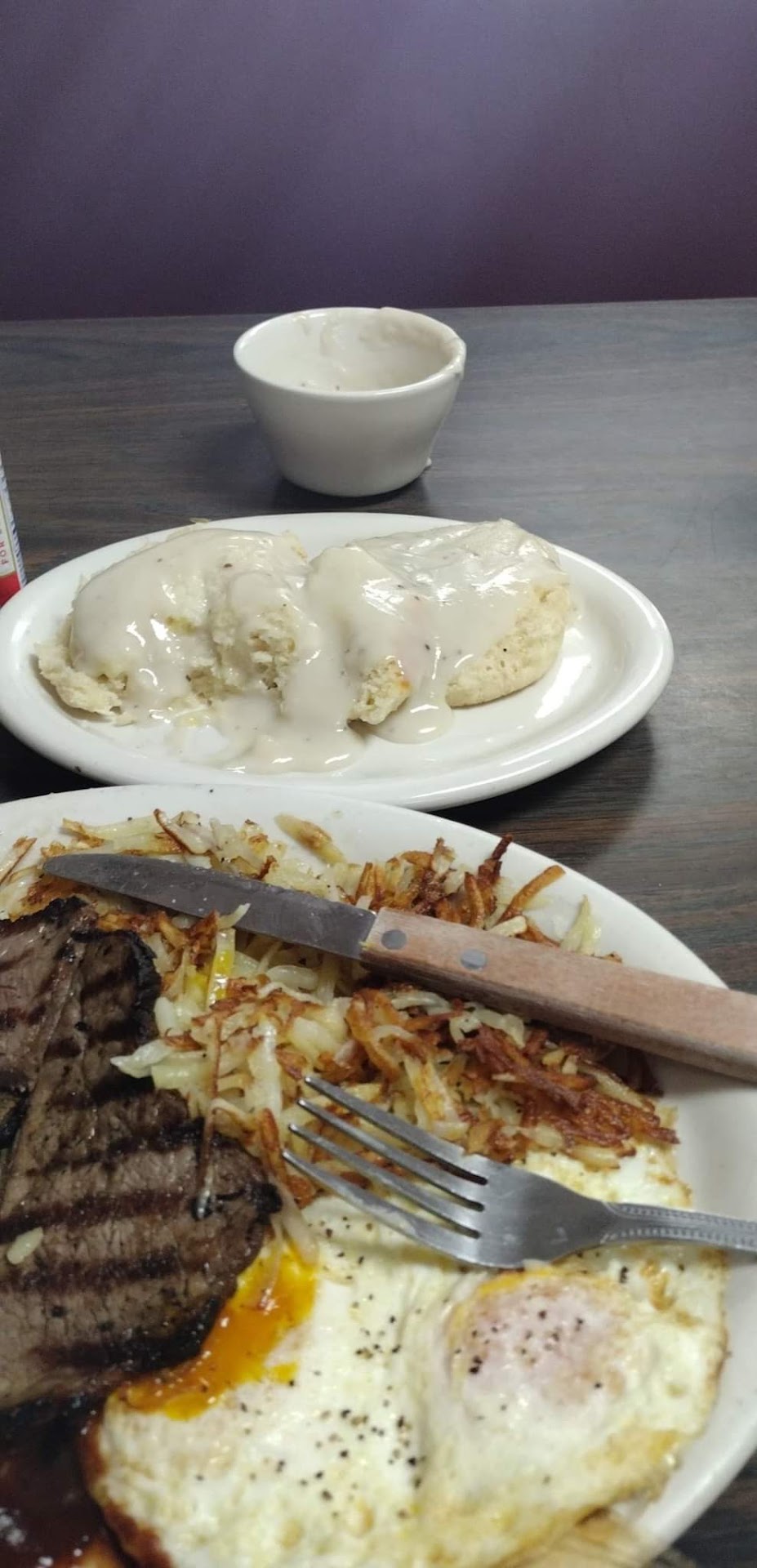 Read moreThe 2nd to last time I went there with my son, I ordered the steak with sautéed mushrooms, gravy and biscuit, eggs and hashbrowns. I ordered the steak rare, got it medium to medium well. The gravy was so watered down, not thick and creamy at all. The rest was fine and I was a bit disappointed by the food. Today we went, my son, wife and I, to eat on new years eve and they closed and locked the doors as we were pulling in to eat, without a sign or without telling us face to face that they were closing early. They finally put up a sign but it said they were closing at 1pm, we were walking in at 12 exactly. Terrible customer service and incredibly rude, money talks and bull crap walks, I'm talking with my wallet and never coming...