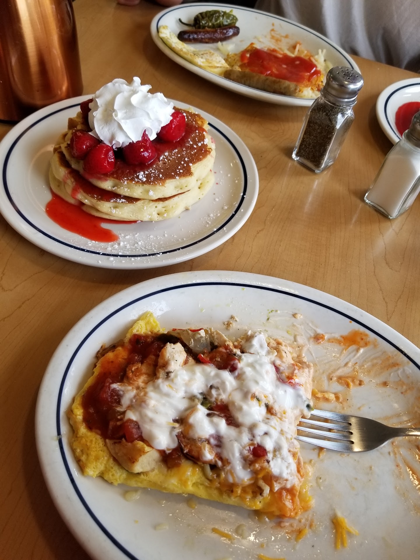 So I have never had an omelet, and wanted to try one today fir the first time, but still have some pancakes. To my surprise, the steak omelet was HUGE, but delicious. However, the pancakes were not. I coukd easily tell they had been sitting out for some time as the edges were hard and stale, there were green and black spots of I don't know what on them, presumably from other stuff touching them, and the pancakes were lukewarm at best - the butter wouldn't even melt. Considering I was looking forward to the pancakes the most as I don't eat them very often, AND this restaurant has Pancakes literally in its name, I believe they could have done much better. But, the omelet half-way made up for it. In contrast, the interior of the omelet was scorching hot! And of course, I appreciate any restaurant that serves Pepsi instead of coke. The server was attentive, checked on me a few times, and gave me a to go cup fir my drink. Despite it being nearly packed full of customers, I was surprised to receive my omelet within 5 minutes of ordering it!