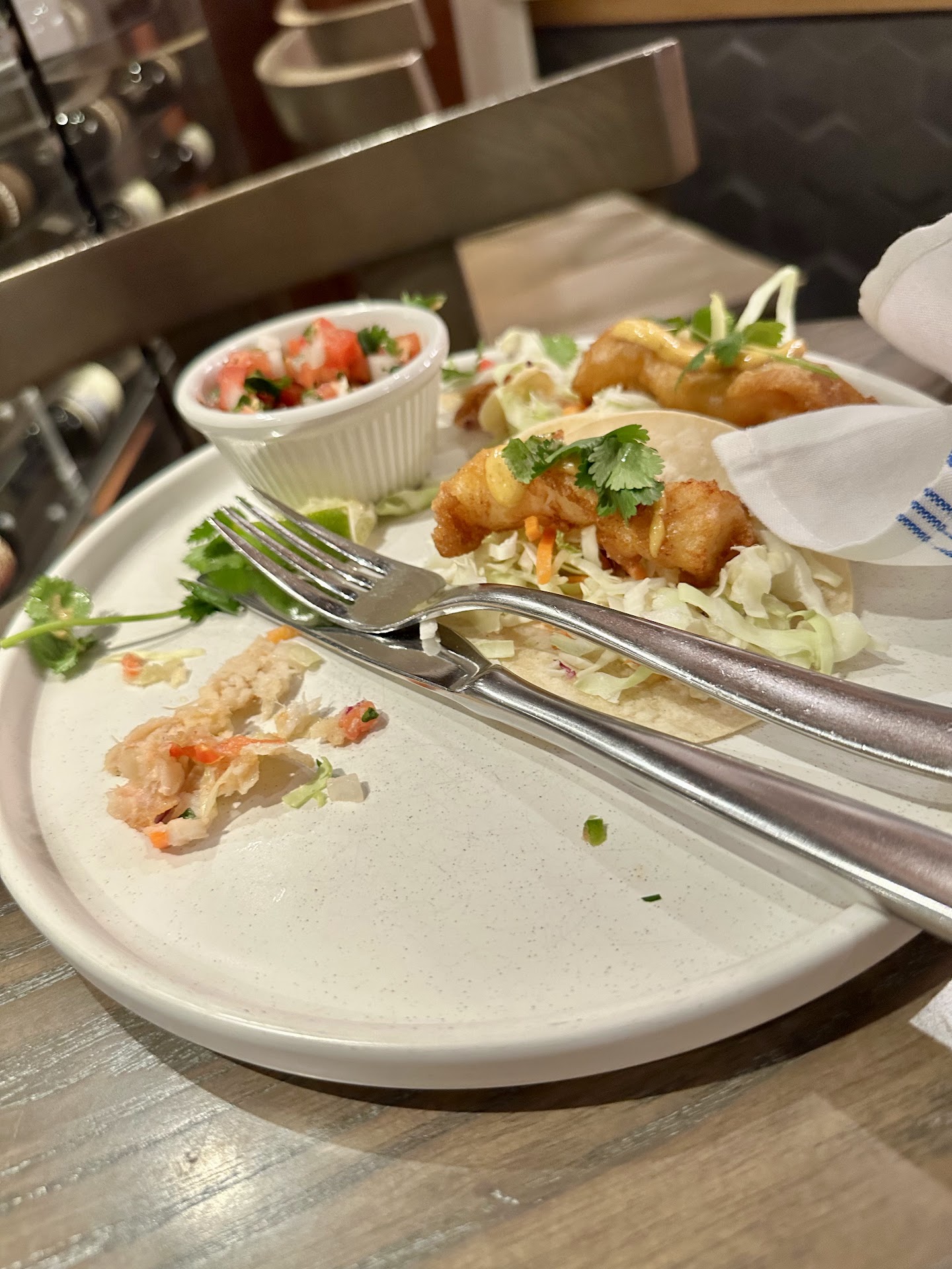 Got fish tacos. Bit into the smallest tacos ever. Spit it out on second bite. Couldn't even finish one. Hopefully I don't get sick.