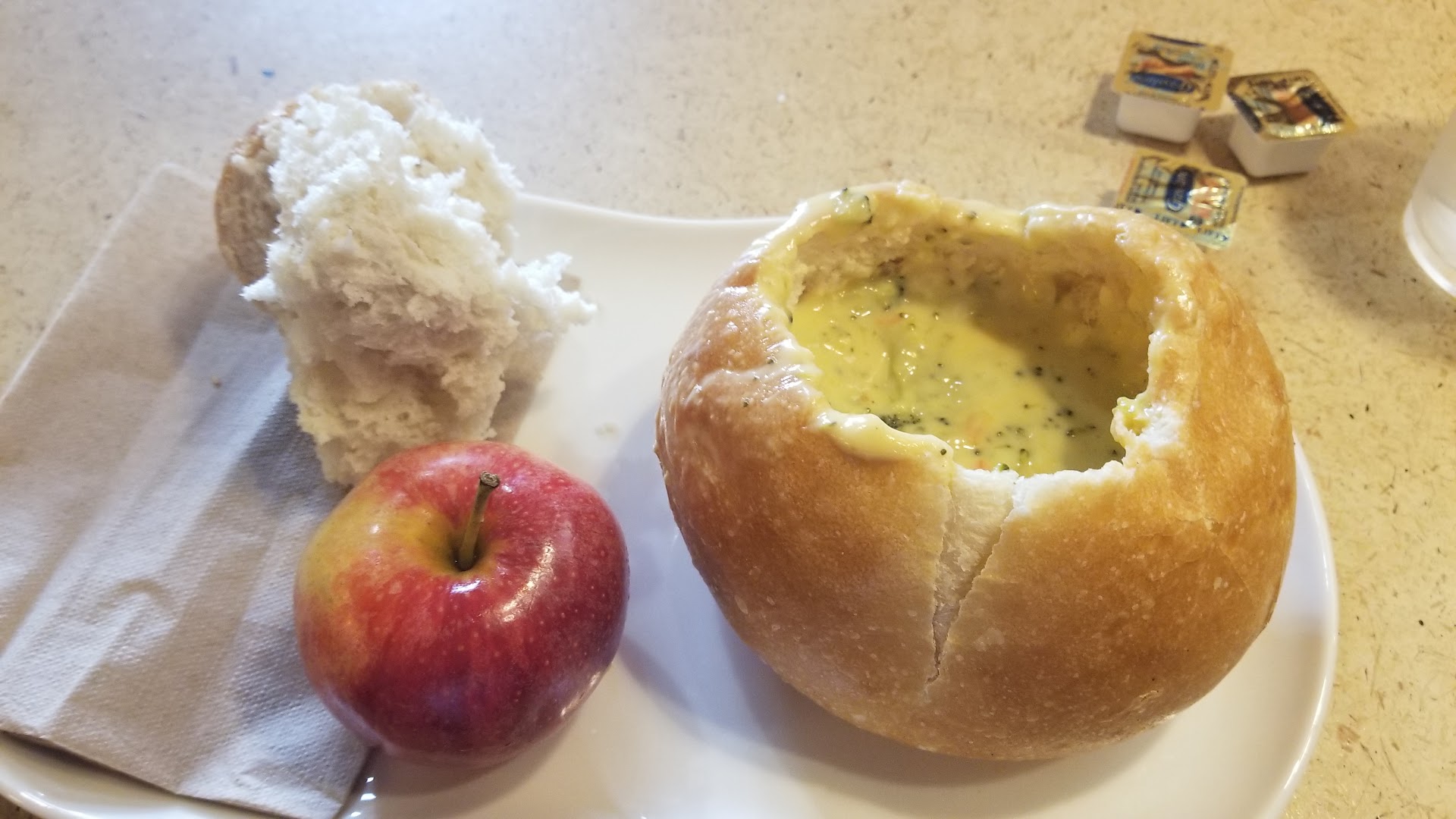 Read moreAll Panera locations and offerings have seriously gone far downhill! This location is the worst I've been to so far, after coming to these establishments for more than 10 years, it costs an average of $11 to get a substandard made soup and half sandwich, which used to be like $6.79. The bread used to be amazing, and now even that basic is doughy, and lackluster. See pix of the sourdough bread bowl that has zero crunch and is half full when brought to the table. This particular location is especially dirty.... had to go to 5 tables before finally settling and wiping off a "clean" one from the piles of debris. I can't bring myself to finish this or pay for this over commercialized garbage again at premium prices. Done. Sad....I used to be a regular customer, minimum one a week. Oh yes... and they didn't bring me a spoon for my soup.... and said they would be back. Never did till I reached someone down, and they gave me a to go plastic spoon lol. Keep it...