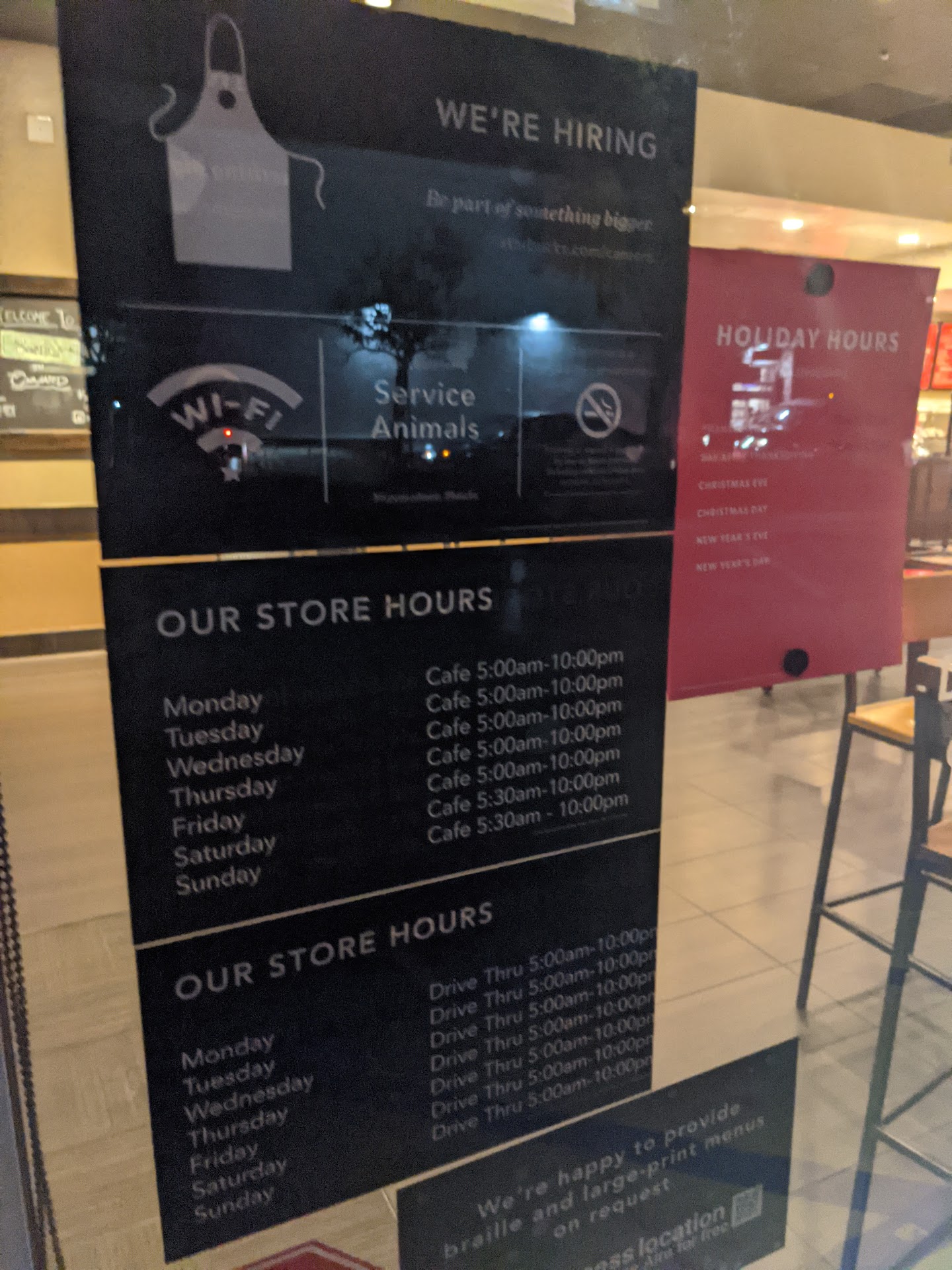 Customer service was number one. I went inside the Starbucks Cafe to buy some few things to eat. And they have a small gift shop so I bought some things. They have a drive-thru in the morning They have the best brownies. So far I like there bananas too but they sold out.