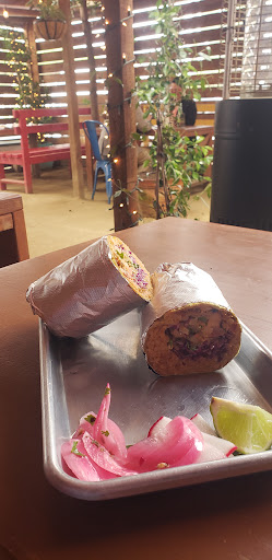 You can eat out front by the street which gives a nice view of Plaza Park. I saw i. The back which has a welcoming and relaxed homestyle vibe with table nestled with a cover tried with plants on a hard dirt surface which made a nice vibe like places I would eat at in Baja. Very relaxing, highly aesthetic, super clean, well decorated, and even the restroom was very clean and fresh. The staff were nice and welcoming as well.