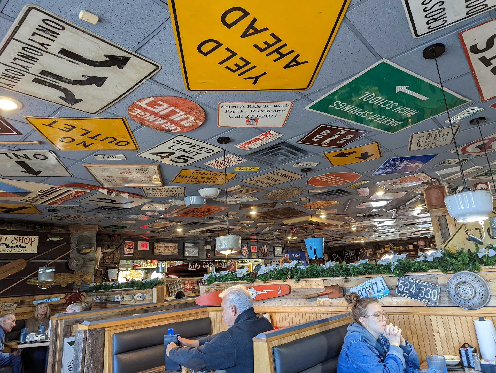 While all this sounds pretty normal, the portions were huge and the flavor memory inducing good. Those pancakes were about 14" across, loaded with blueberries cooked in, and had more piled on top! They gave her a pizza box to take home the leftovers and we had two more meals there with them! The dog got some because we couldn't finish the job.