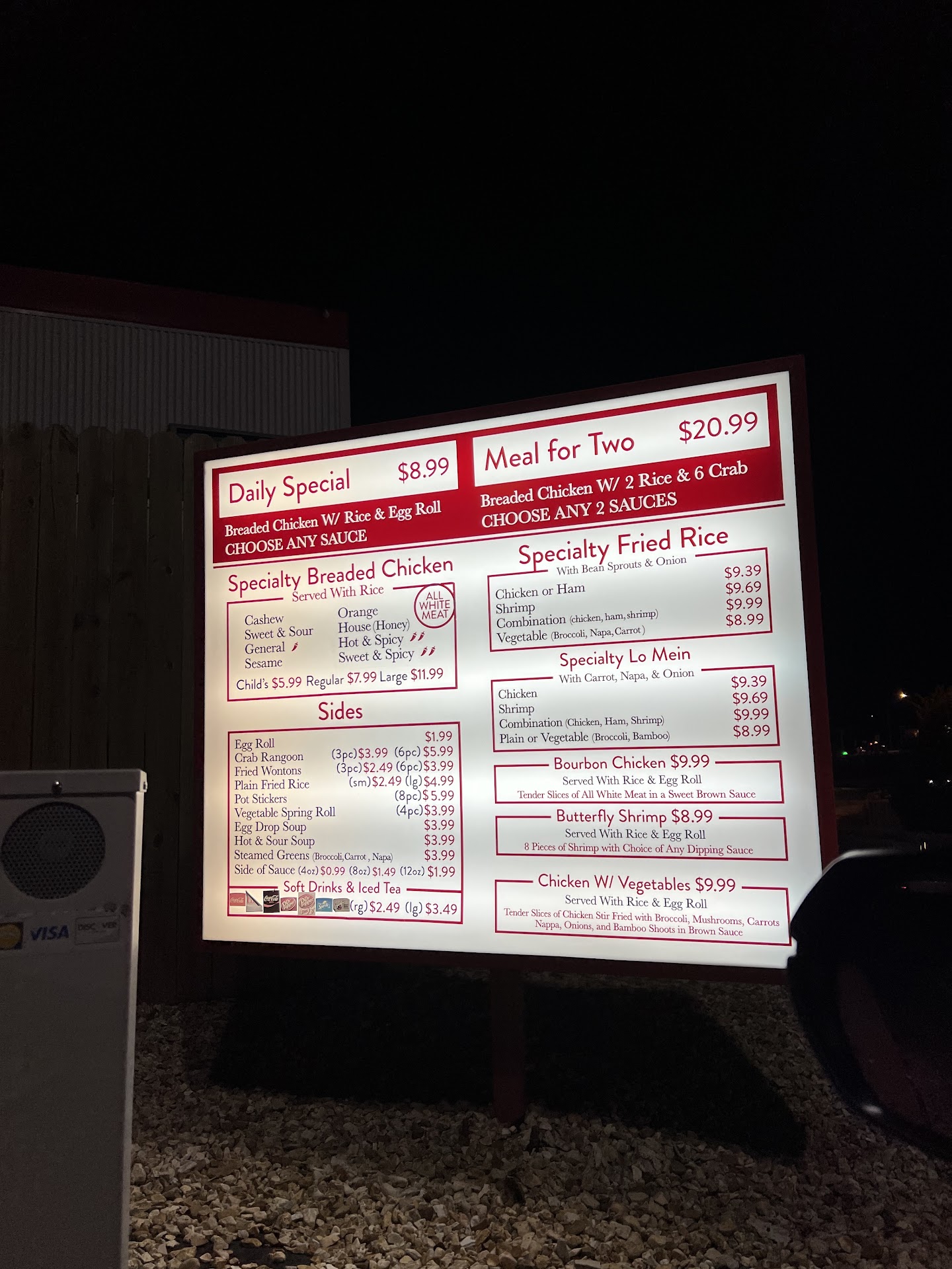 The menu is mostly standard Chinese/American fare. Nothing on the menu stands out as a must have, but it is all good. The sauce, like almost every Midwest Chinese place, for the dumplings isn't actually plumb sauce, but it is the closest around this area.