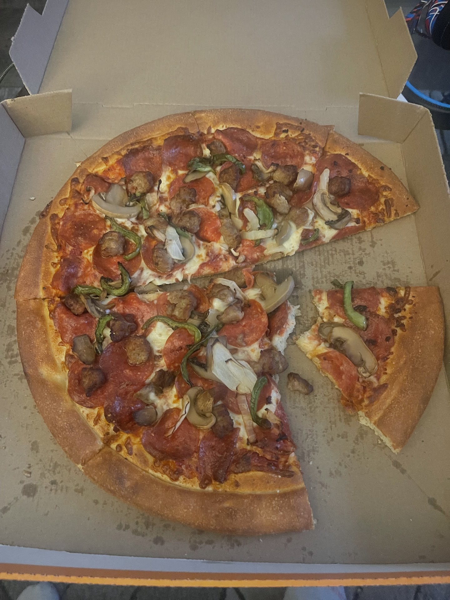 Read moreNow this is just a bummer. Just left vbs from Church and thought we would make it a family pizza night. Sad to say this is so raw the dough is just falling apart. Never have I had a pizza so raw. It fills like they took it out at the half way point. Now keep in mind i wasinnowhere near being in a hurry .and I'm not the type to take it back because I worry about someone doing something to it so now I paid for a 3meat and a sausage pizza that even my dog won't eat. Come on you can look and see its not good. Macaroni...