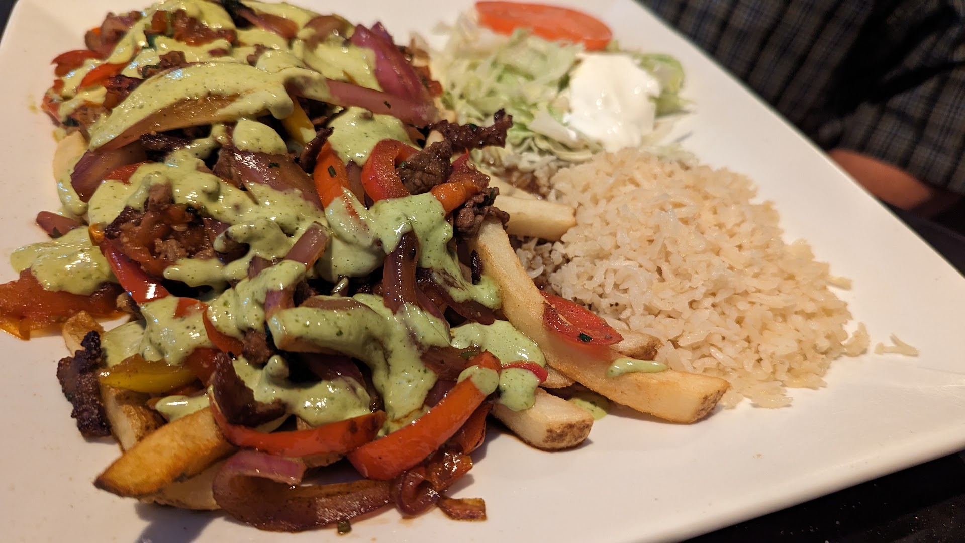The food: It was delicious and reasonably priced. My wife and I both ordered the California Burrito and the portion size was very very generous. Everything put into the plate was fresh. The chicken and beef were seared to perfection and perfectly seasoned. The French fries were perfectly fried. The cheese poured over the burrito made the shell soft and it almost melted in your mouth. The sour cream was fresh and the lettuce was crisp. The pico de gallo was obviously freshly made in house as the quality was top notch.