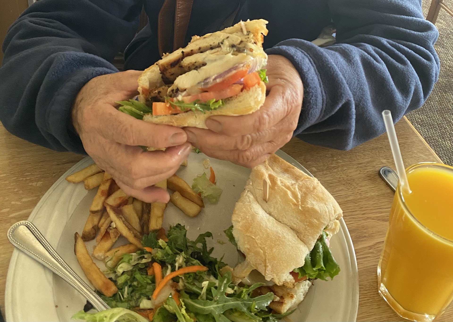 My wife enjoyed her salad with mixed greens, sun-dried tomatoes, olives, and croutons and on the side, blue cheese dressing.