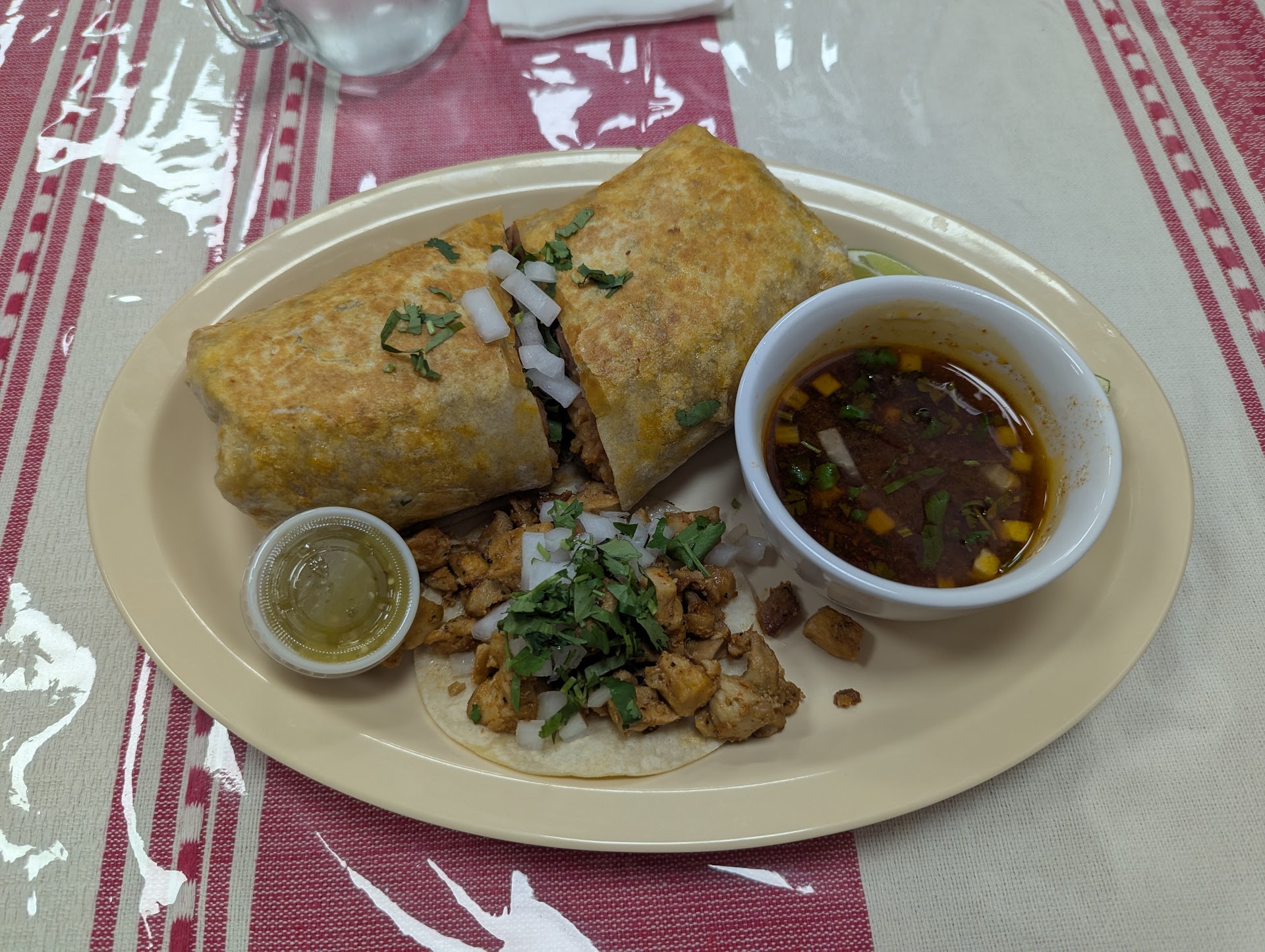Aquino's is clearly located in the bones of a Chinese restaurant past. Conceptually, it's actually pretty fun. But there is no real attempt at integration -- in fact, the whole place feels a little uncomfortable in its own skin, like a hermit crab squatting in a shell that's much too large for it. The walls are white and undecorated except for a few (admittedly cute) murals, contrasting with the array of colorful tablecloths that inhabit the dining hall. I'm willing to chalk this up to a recent move-in, and hopefully morale will improve. But generally I try not to weigh atmosphere too highly in my reviews, so let's discuss the food. I thought it appropriate to try the birria burrito given this is a birrieria, also also ordered a chicken adobo taco. The taco was quite nice; the chicken was well-spiced and moister than I am used to in chicken tacos. But considering the 3.25$ price tag I was expecting a bit more. What I got is closer to the 2.50$ street tacos that one can find almost anywhere. The birria burrito was also enjoyable. I don't claim to be an expert on birria (I've scarcely tried it, really) but the meat was pleasantly succulent and not oily. The burrito itself was somewhat greasy but within reason. However the consommé was shockingly flavorless. I expected a bit of a kick from the bright red soup but felt... nothing. Ultimately, I wouldn't call the food bad or even mediocre -- it was genuinely good! -- but in a place where competition for good Mexican food is so stiff it's hard to say I would directly recommend Aquino's. It's the type of place I would stop by if I was driving through and was quickly scanning the map for a place to eat. I do think there is easy room for improvement though. It would feel much more comfortable in a smaller location. There were also some eyerolling Cheetos-based menu items, including a bowl of instant ramen. I guess if the Tik Tok marketing pays off I wouldn't blame them. Simplifying the menu and not trying so hard would...