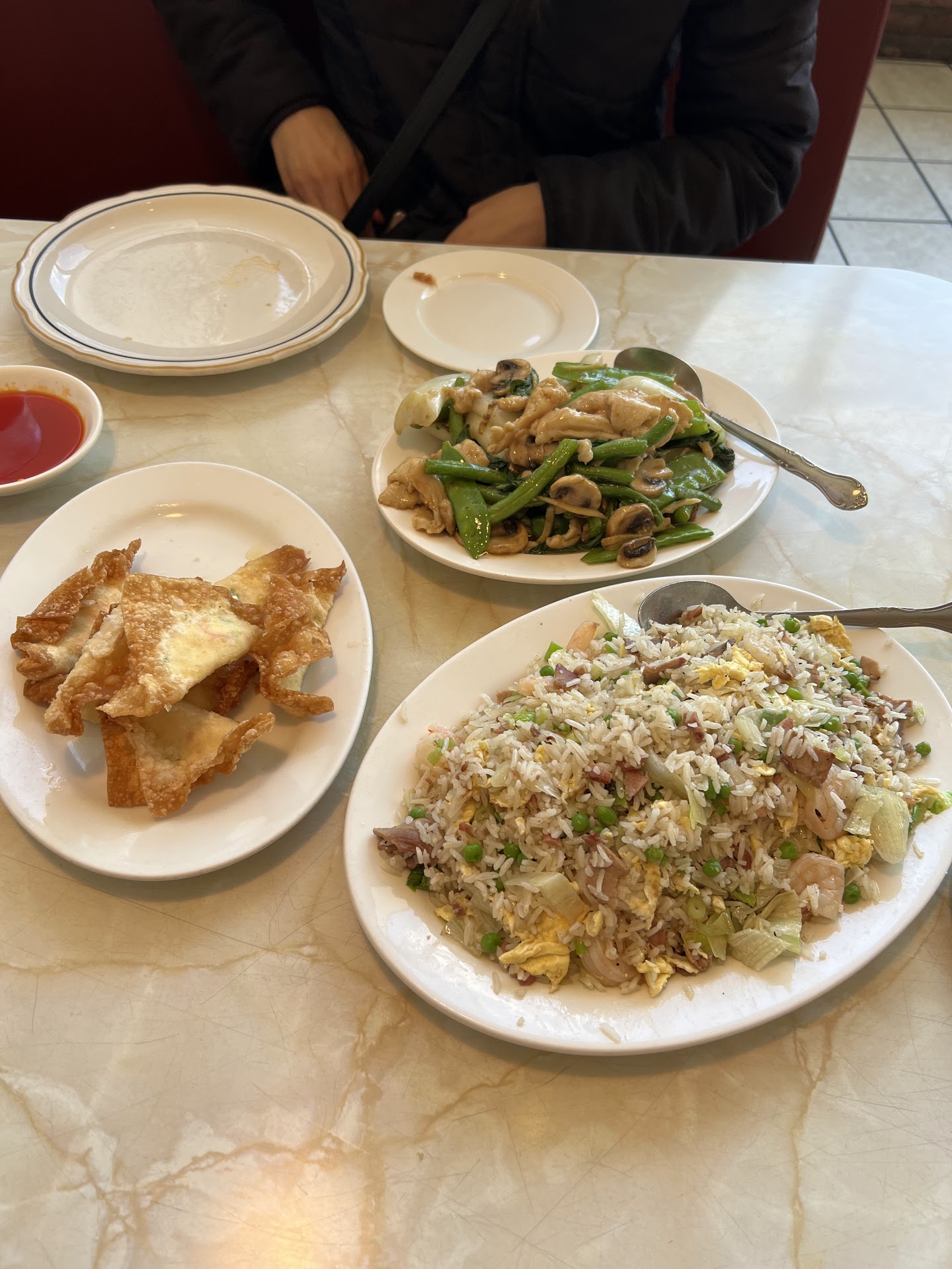 We ordered 3 dishes from the dinner for two. On the plus side, the fried rice alone was enough for two of us. However the vegetarian egg rolls were heavy on celery (which I dont care to eat). The egg rolls were a bit unusual in that they are regular wonton wrappers that were then breaded and deep fried. The crispy outer shell was a nice change, but the oil it was fried in had overtones of a gamut of other things fried in the same oil. And the filling was about 45% celery. In addition, this preparation method left the inner egg roll limp and oily.