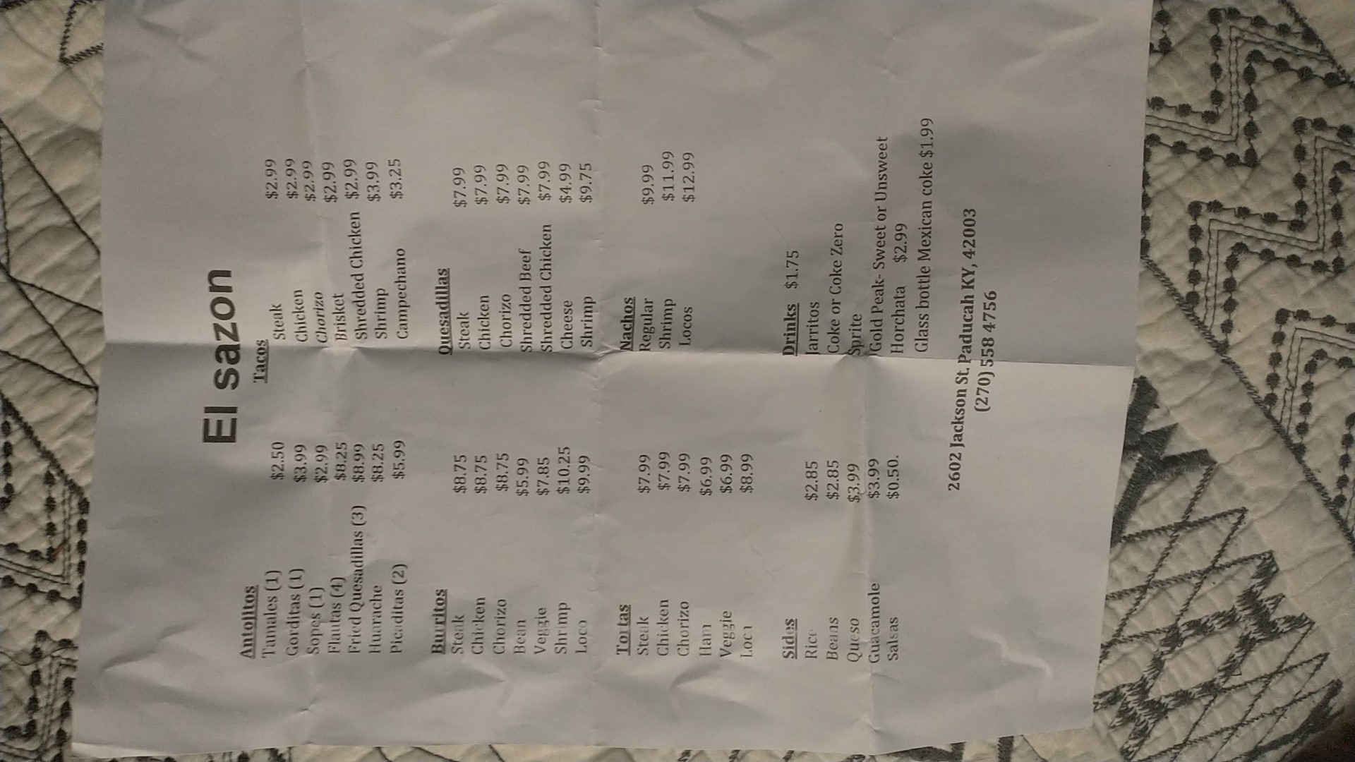 Read moreThe food was traditional Mexican and very very good! If you like authentic Mexican food such as that served at a restaurant in Tijuana, you'll love El Sazon! I implore you to try this food. The food is freshly prepared and comes with all the traditional fixings. It's definitely a cut above the fast food types of most Mexican restaurants. But the service is top notch and very fast. Myself , the misses , and 4 children all ordered and ate alfresco, which I loved as it was nice and cool out after it stopped raining. Even the hit sauce was traditional and fresh made. Everything was fantastic. A pic of the current menu is listed...