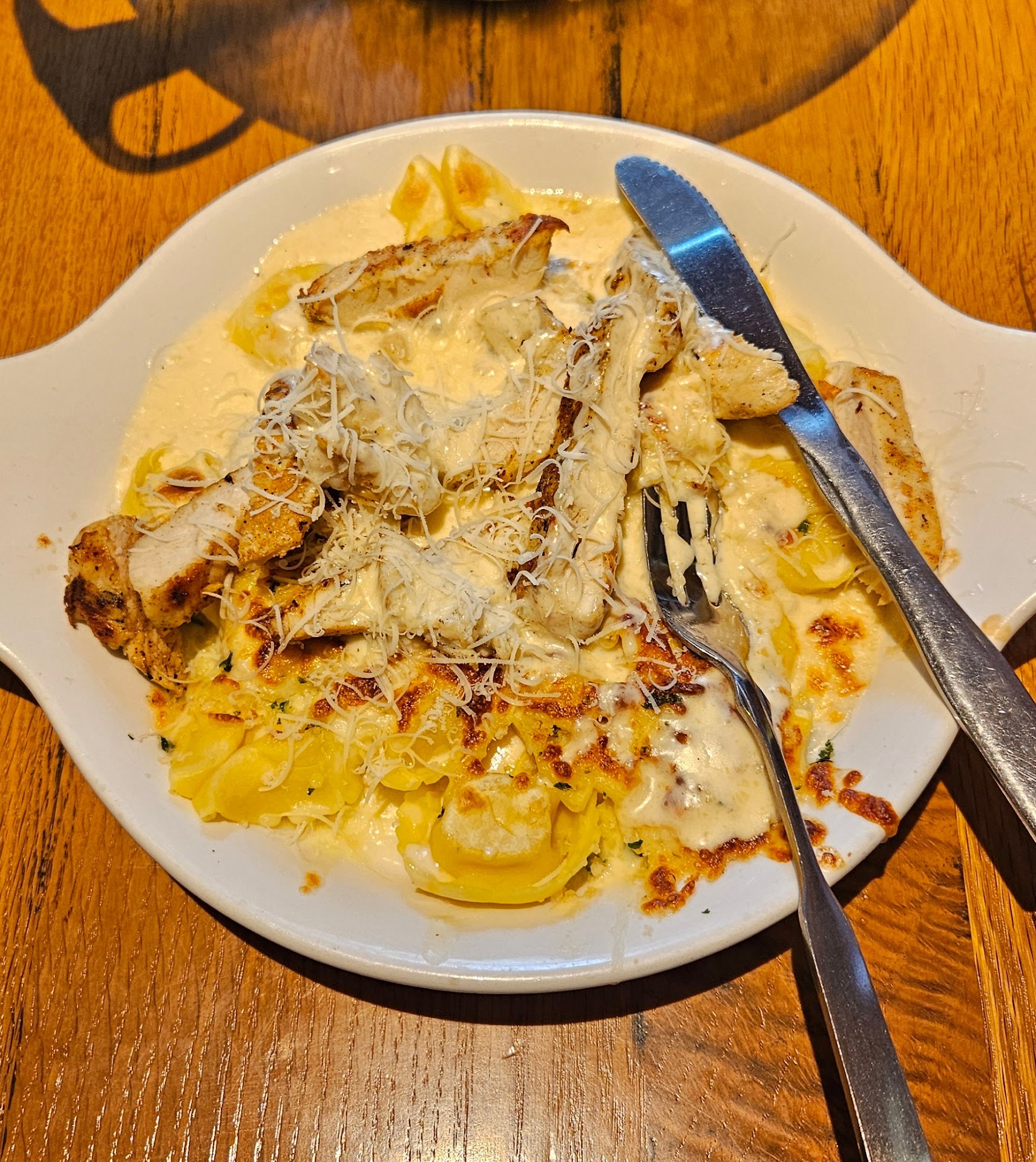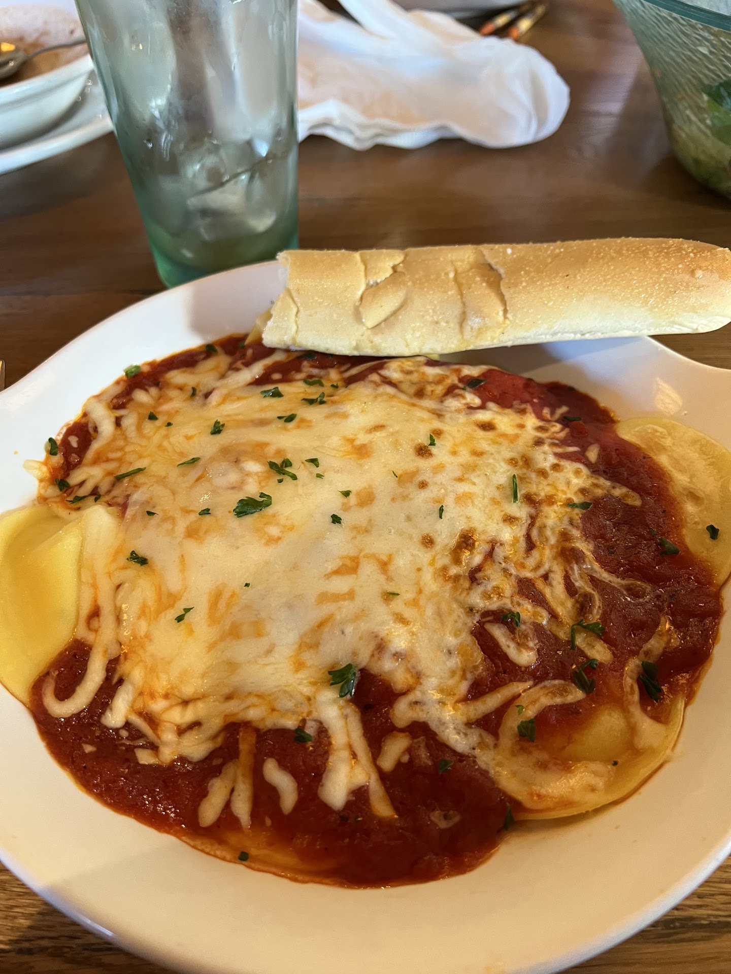 First, out of 6 sets of silverware, 5 knives and 2 forks were dirty (dried food, not just water spots). The waiter was friendly and brought our salad/ soup/ bread. Bread & salad were average, but the soup was quite good. With hungry teens, the small salad servings went fast. The waiter came back and said he'd get more bread and asked if we needed more salad, to which we responded affirmatively. He never brought either. Eventually, after a moderate wait, several other staff brought our entrees.