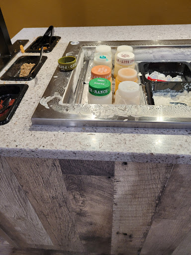 Read moreWhat a disappointment. It's a brand new place and it was dirty and the service was nonexistent. They charge you at the door (about 30% higher than the other pizza buffet in town) then they ignore you. No one shows you the seating area, or explains where to get plates silverware or drinks. There is food all over the floor, and there about 8 to 12 employees hanging around the walk in area (see pics). There are about 8 pizzas at the buffet, about a third as much as their competitor. The salad bar is small, but it has what it needs. Unfortunately the dressings are not maintained, unlabeled, covered in slime, disgusting (see pictures). To be fair, they have a fried chicken bar with corn, green beans, and mashed potatoes with gravy. That's a bright point. Lastly you know that server that comes around to collect your empty plates? They...
