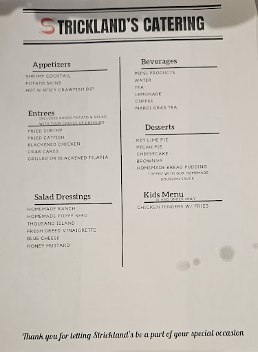 Read moreWe have been to Strickland's many times. Typically a great experience. We decided to drive and get a to go order today around 4:45. My husband and I ordered the blackened catfish dinner with one side. They were $13 a piece, our total was over $32.00. When my husband looked at the receipt they had charged us a 10% gratuity plus charged us for the to go order. This was not mentioned on the phone. The tip wouldn't be that big of a deal had we had great service at check out. There were only 2 customers in the restaurant and we had to wait over 5 minutes before anyone ever came out. Then we had to ask for things that should be in there. Utensils, tarter sauce, napkins. If you are going to automatically charge us a tip, you should automatically be on top of the food and what goes with it. I had red beans and rice for my side, which I have had many times and I usually love. Today it was horrible! And the fish was dry. So we will not be coming back to be charged for things we didn't want. And paying that price for food that isn't up to par anymore.