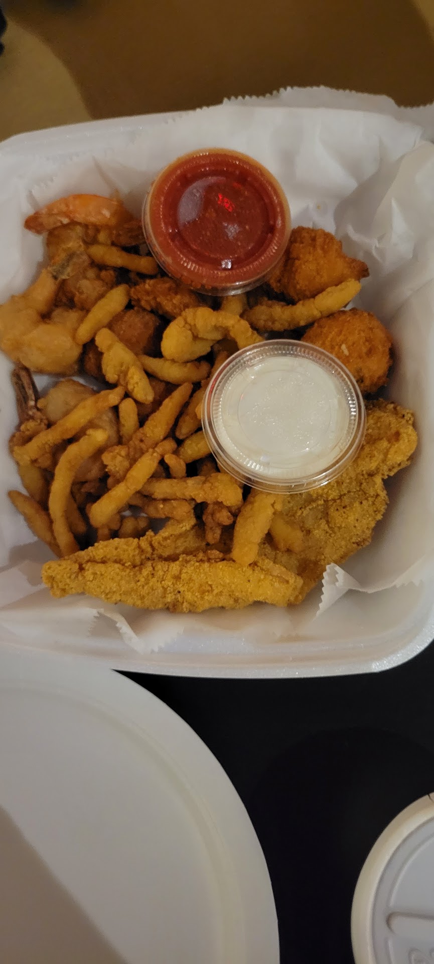 I ordered my usual, the Harris platter. The lady that took my order was very friendly and told me it would be ready in approximately 15 minutes. I was already in the area so I was there ready to pay in less that 10. A minutes or so later I was greeted and the lady at the counter went to retrieve my order. As I was paying, I confirmed that all of the relative condiments (sauces) were in the bag, and she took a quick look and said everything was there. So I paid then exited. As soon as I got into my car, I grabbed a french fry and immediately noticed that they were already luke warm. Not wanting to turn around, I continued home. FYI, If the fries were the only issue I probably wouldn't even be leaving this review. After arriving home 5 to 10 minutes later, I prepared to eat my food (after briefly microwaving my fries) so I placed everything into my favorite plate, which brings my next issue. The clam strips were barely "strips," they were more like a few strips and a bunch of crumbs akin to what you would find at the end of the bag. Literally, most of them were too small to poke with a fork. Smh. Highly disappointing! And possibly the worst infraction of them all... when I went to eat my beloved coconut shrimp--- which I always save for last---- THERE WAS NO COCONUT SHRIMP DIIPPNG SAUCE!!! I have never eaten coconut shrimp without the corresponding sauce. That's utterly rediculous. Especially given the fact that I asked if all of the sauces were in the bag! And this trifecta of carelessness and lack of attention to detail is the nature of my complaint.