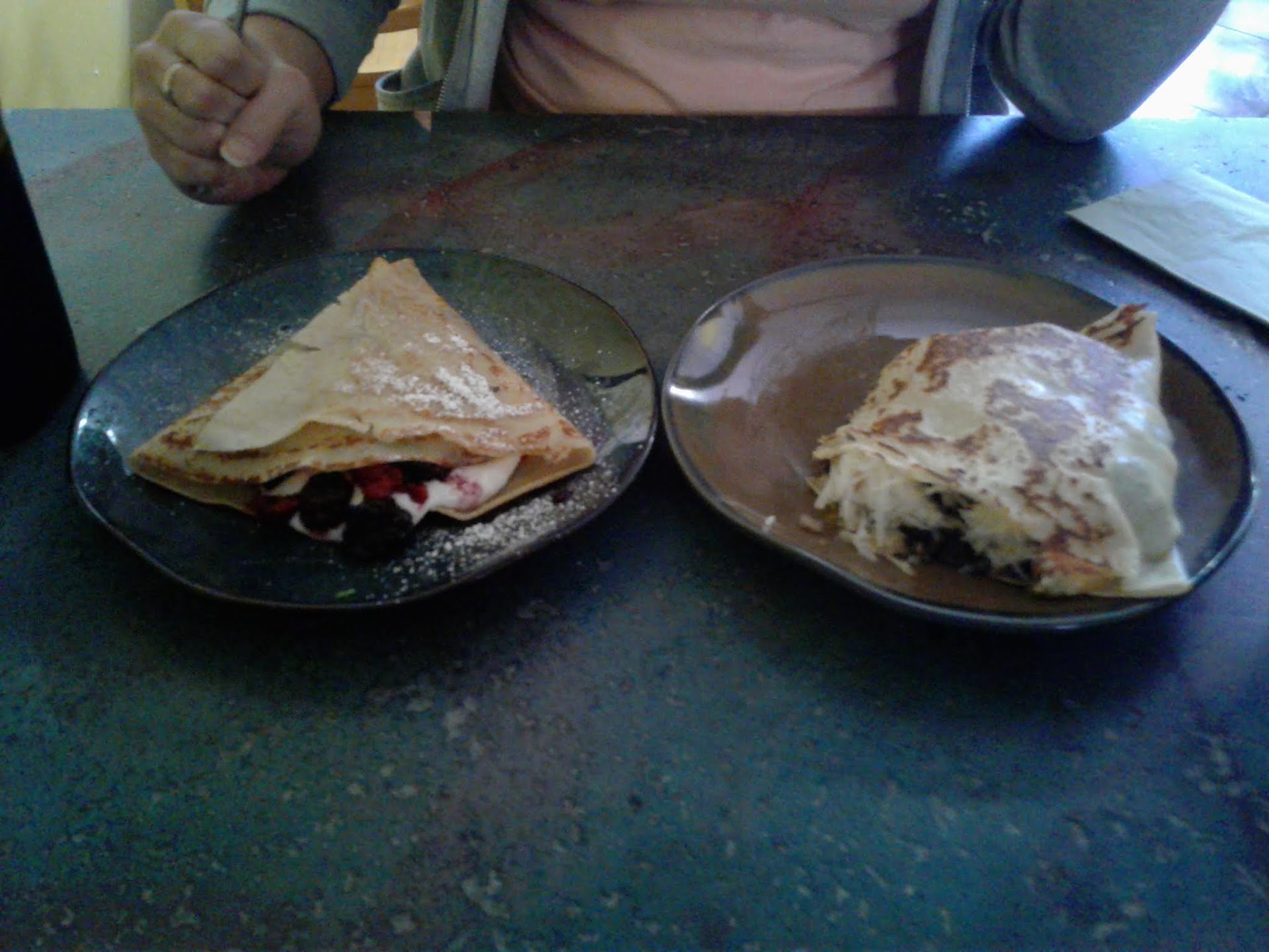Read moreWhat I liked about Canyon Crepes...the crepes. What I didnt like... everything else. The food was good. The cream cheese sauce was delicious but don't dare dream impossible dreams like requesting it be on the side. I think Seinfeld might know a cousin of theirs making soup in New York. We arrived to a crowded area of nobody save one table of four who already appeared to have their food. My sister walked in first a few minutes in front of us. She asked for a latte to which the woman replied she could pay for it then or wait until everyone arrived. My sister told her she thought they might like to start our order because there were a few of us but that if she really needed her to she would pay separately. The cashier responded it would be easier if the whole party was here and ordered together.That was fine even if it was a little strange. The crepes say you pick 5 of the toppings to build your own. I asked for chocolate sauce and cream cheese sauce on the side. I was told no. The customer service was not exactly warm and fuzzy throughout our time but this? I explained that I don't like the sauce to seep into the crepe and I would really appreciate it on the side since I had never tried it before and wasn't sure if I liked it. In a nice gesture she did get me a spoon to try. I then said I liked it but just prefer it not soak my crepe. I let her know it was fine to not use any container for it but just smear it on the side of the same plate. She said no because, I'm not kidding word for word quote, "if we give it to you on the side you will waste it and throw it away." I let her know that I appreciated her concern but my food is mine to enjoy as I pay for it and would appreciate letting me worry about it's where abouts. She and mystery, no sides cook in the back, took 45 minutes to make 2 lattes 1 espresso and 4 crepes and we were the only order. By the way, the sauce did not, after all that battle, come on the side. It came smeared both together all over the top so guess they got me there and no surprise, I didn't like it like that. Had the coffee's been started sooner than 10 minutes after the order was placed and there was a whole lot of nothing happening, like say starting the coffee's when we came in and sat down, the flow probably would have gone smoother. If the help is replaced with competent, freindly people it would likely be an excellent...