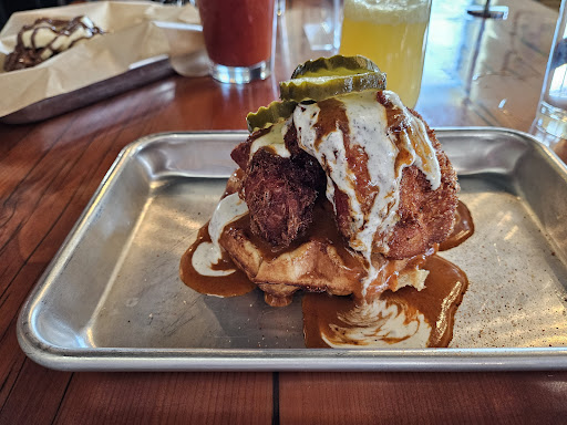 I hate to hate on any place of business, but this was the worst food I've ever had and one of the worst experiences. One of our waitresses told us the lemonade was all natural, and after it came, she pointed out the glitter inside (edit: I did not realize the lemonade was made with natural glitter, thanks for the clarification in your response here). While the lemonade had an ok flavor, we weren't looking for something like that, which is why we asked.. Those tiny lemonades that we didn't even drink cost a lot. They started bringing our food out and realized we ordered the fried chicken, not grilled. Then they had to go cook the correct order, taking quite a while for everything (edit: I meant the overall experience taking a while, not the second time you made the food). When they brought the correct one out, all the chicken was burnt and really tough, very hard to chew, with 2 way too huge pieces of burnt fried chicken on a bun. They brought out 2 waffle and chickens for the kids when we only ordered 1 for them to split. I think they took one off after we told them that.. But we spent $65 there and it wasn't even close to worth it. It was also really loud and not much room and the outside looks like a rundown house, so that's why I put 1 star for the atmosphere. We only had 2 adults and 2 small kids and the ticket was $65... crazy. Edit: They DID actually give a refund to me and for that I am grateful. But I won't be dining here again because we just did not have a great experience. Maybe it was an off day because the other reviews are good. But even in the other review pictures, the chicken...