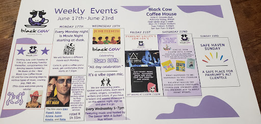 Read moreIf you are seeking a new opportunity for coffee that tantalizes the tastebuds infused with an atmosphere that soothes the soul while you sit back and sip on their signature coffee creations or something that calls to you, the Black Cow is one of those places if you are in the Pahrump area. If that wasn't enough, a lineup of quality music is offered and on the weekends live music from various artists near and not so far away. I honestly have only been there once so far, but it has my vote for a place for the artist mindset and other people who value a calm place to create and discover their calling in life one sip at a time. This is another place that values an amazing customer service experience with a variety of different flavors. I only had one complaint and it was that I didn't learn about this pourhouse sooner! I believe that the seating area probably makes a visually good location for filming a movie as it made me want to sit and think about how this place could be utilized in a future production for a movie or music video. Try it out for yourself and share the details. Oh, I forgot to mention.. the hours.. Early Morning.. Or late evening (until 9pm) .. Its a...