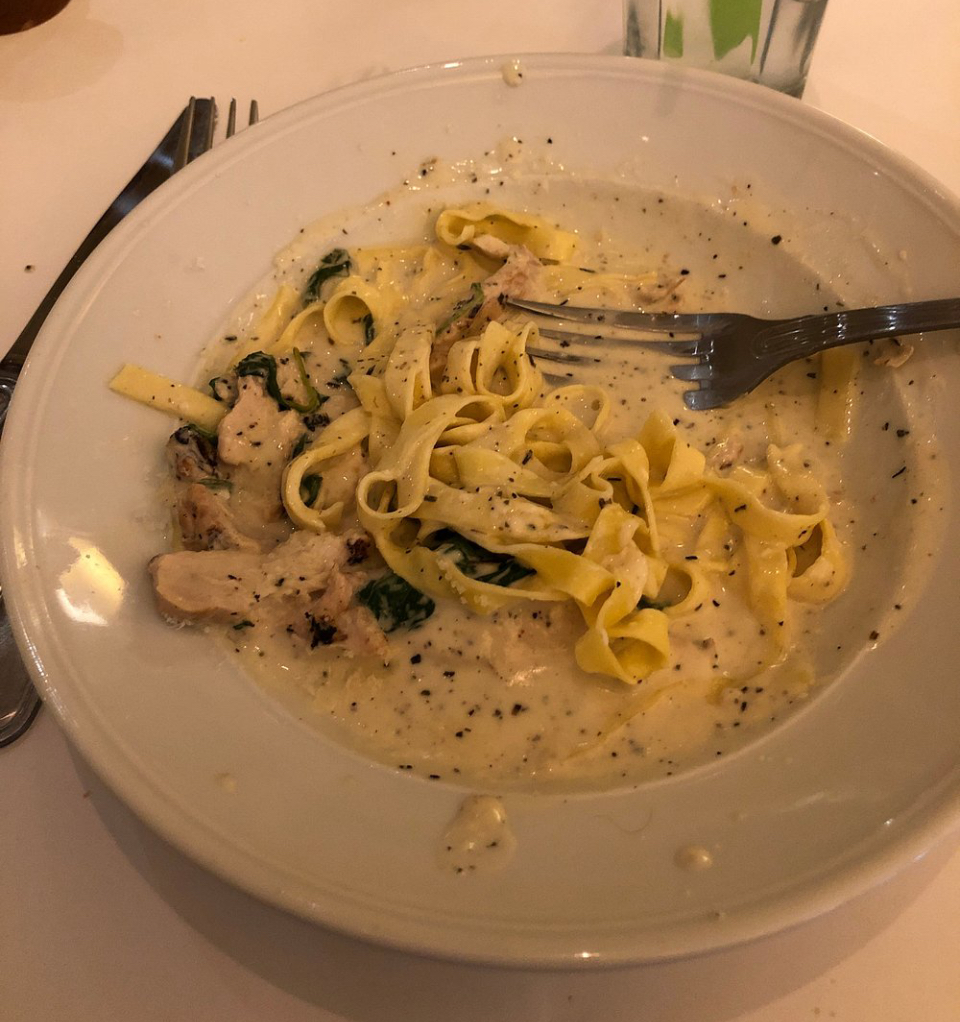 My husband and I both chose the âchicken milaneseâ which is a Romano-crusted chicken with fresh mozzarella, herb pasta and a house marinara, topped with additional grated mozzarella. It was a very large portion size and was absolutely delicious. I cannot say enough positive things about how good it was. It was way too much food for me, so I shared part of mine with my son and still had leftovers to take home. My husband was able to eat all of his food and was very full.