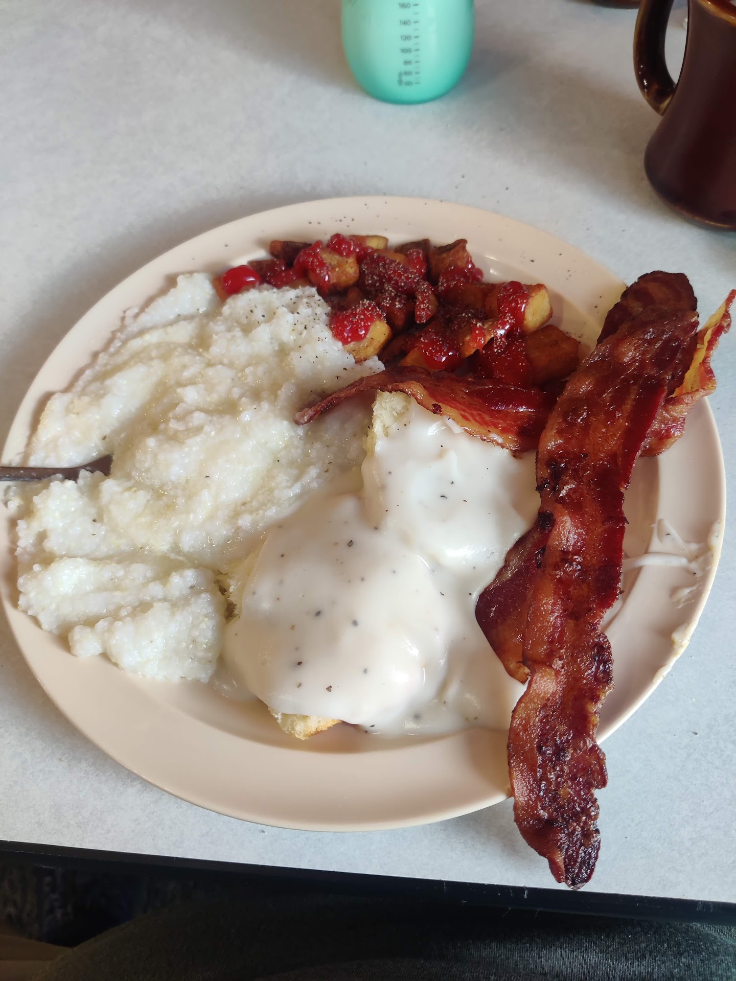 9/7/2024: We were really looking forward to eating here again, and we're SO disappointed. The good: Our waitress was friendly and the service was good. The bad: They've gone to a buffet format, which pushes volume of food over quality. And the quality has suffered miserably. The pancakes were so bland they disappeared, and there were no individualized options like the ones we enjoyed before. No gluten-free option, like the buckwheat pancakes they used to have. In fact, the only items on the buffet I could have without an allergy trigger were bacon and poorly-made grits. The coffee was as bitter as a master sergeant whose wife abandoned him for a captain while he was deployed. The decor included signs promoting gun violence, which were not there before. I am a second amendment supporter to a sensible degree, but I don't want to have it hanging over my head - literally - at breakfast. We won't be back. It was both sad and...