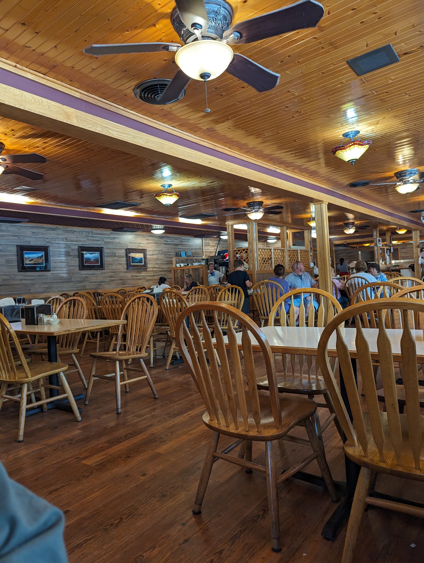 At this point, it almost feels like ganging up because it was that bad. We get in and sitted at a picnic table with chairs and some other diners, doesn’t bug me, I’ve seen this at many places. The thing that got me was server didn’t really tell us about the buffet or really anything about where the plates are or rules of thier little establishment. She took our drink order and was nice enough, I guess. At the lackluster buffet, they had a sign warning that excessive leftovers could be an extra charge. Pretty obnoxious considering how incredibly bland their food was. Think of school lunches without the seasoning or freshness. I had one serving of a few uninspired bites and one drink and left. My daughter had some Mac and cheese and maybe two small bites of the chicken and a dinner roll.