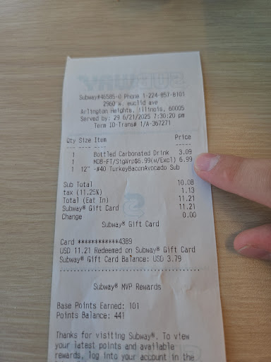 Read moreAbsolutely horrible customer service. I will post a photo of the coupon that the employee said she would not take. She said it was only valid for a free drink when did obviously States buy a footlong and a drink get a free footlong. She said she had to call her manager and was extremely rude when she found out she was in the wrong. She handed the coupon back to us and said scan it, then she said give it to me. All this being said with a horrible attitude. The food was fine, but will never ever ever go back to this location because of this woman who clearly does not understand what a coupon is used for. I urged anybody to go find a closer Subway in the area and give them your business and avoid this place...
