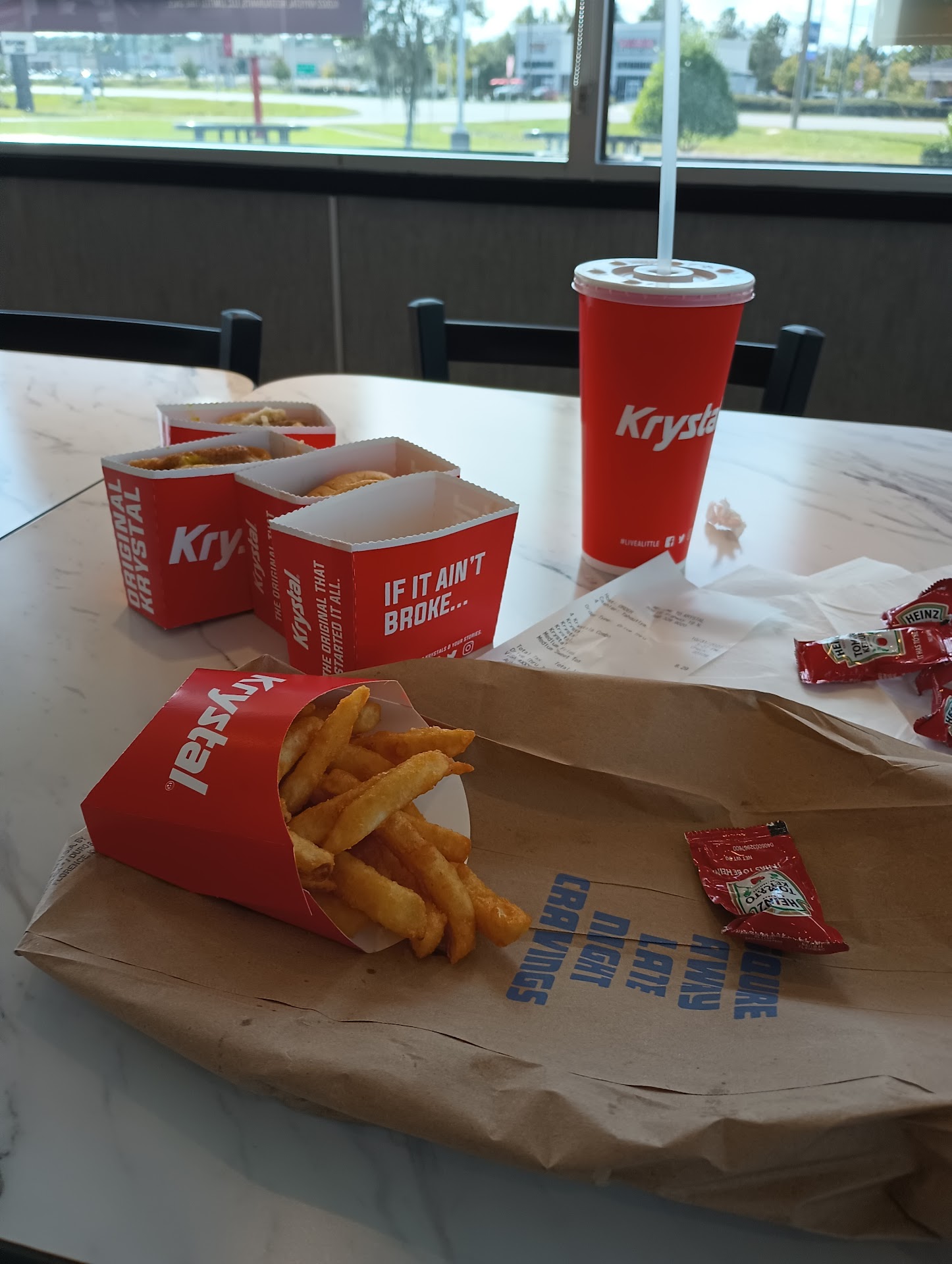 After a VERY long day on the road, we rolled through Palatka and the only place open to eat (on our way home) was Krystals. We were pulling an empty 43' trailer and the building was locked. My husband went up to the door and they told him to walk around and order at the drive up window. There was a few cars ahead of him, he ordered and we waited, waited, waited (we ordered 3 cheeseburgers and 1 chicken sandwich) and waited. What we were hoping was a fairly quick in and out....NOT! We arrived shortly before midnight and finally got our food about 45 min later!!!! That's ridiculous to say the least. They would come out about every 15 min a hand a small bag to the cars waiting. One girl was so upset she got out of her car and went to the front and entered the door. You could see she was upset (we don't blame her) as she had by then waited 30 minutes. They said they were going to call the cops as she was trespassing. You could here all that was being said sitting outside in our vehicle. To us, it's a public restaurant and if they forgot to lock the door...then it's not trespassing to us. I agree with the other review as they seem to work at a snails pace. The order wasn't THAT difficult and it took WAY to long for FAST FOOD??? Nothing FAST there!!
