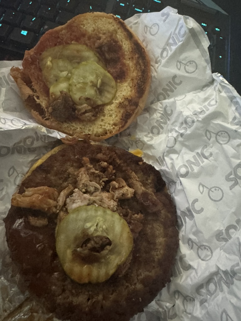 (While we were waiting we looked inside at the employees of Sonic and they were just standing there, or on their phones with corn dog sticks in their mouth and dish towel wrapped around their head.)