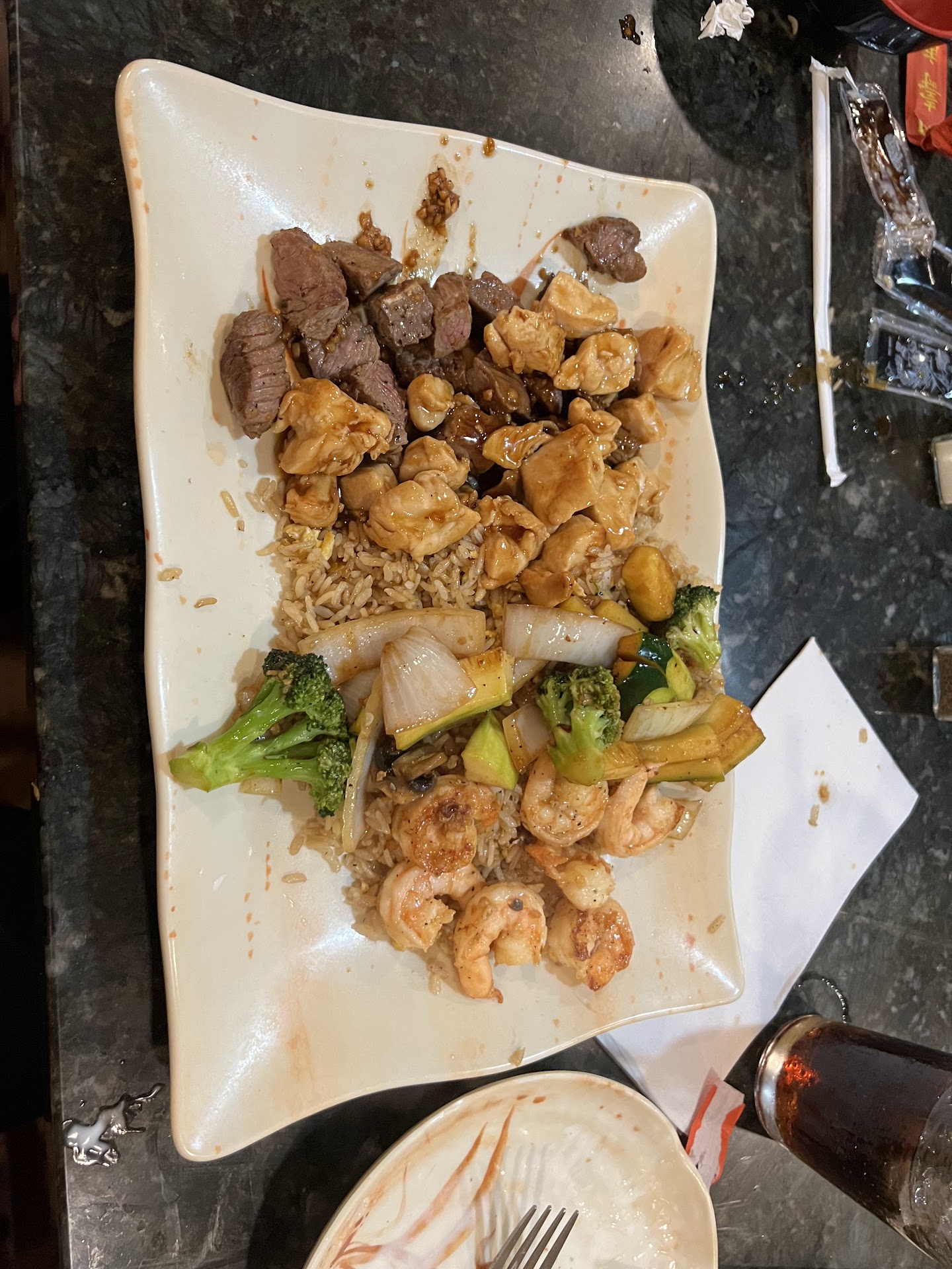 Since moving to the new location, we've order ToGo once, and it wasn't very good. (At that point, they weren't doing dine in.) We didn't go back for a very long time. Today I decided to give it another try after hearing great things about others' experiences. Staff was friendly. Place looked cleaned. No bad smells like some of the places in that shopping center. I had high hopes. I ordered the steak hibachi exactly the way I used to order it at the other location. It was overly salty, but otherwise tasted ok. I was very disappointed that they no longer have egg, peas, or carrots in the fried rice, and no longer have carrots in the vegetable mix. I have always ordered the veggies without the mushrooms and zucchini, and ask that they just put in extra carrots and/or broccoli instead. All I got was rice with no veggies or egg, steak, and a small amount of broccoli with onions. I ordered my food off the the lunch menu during the lunch menu time frame. I thought perhaps the portion of broccoli was small because the lunch portion is smaller on purpose. I asked the server about the missing veggies, and he said they just don't make it the same way anymore, but if I ask for carrots in the veggie mix, they will add them. I did say I wanted carrots, but didn't get them. I had to wait quite a while for my food, despite there only being 1 other person in the restaurant when I arrived. Someone did come over and apologize for the delay, which I appreciated. That same lady came back when I was only about halfway done with my food and left the ticket and a fortune cookie. She didn't ask if I needed anything else or anything. Just showed up with the bill and left it on the table. Although she said to take my time, it came off as her hurrying me up. As I had patiently waited on my food to be made, and it took longer than it should have, I was a little offended. I bit my tongue. My daughter joined me and would have ordered food, but saw that I already had my check. She decoto just go elsewhere. I was absolutely insulted though when I realized that I had been charged for the more expensive dinner menu rather than the lunch menu...after having to wait so long for my food and getting less food than I asked for! They had already been yelled at by the other patron because he had to wait to pay his check because no one was in the front of house. He had been rather rude about it and yelled out that either someone come take his money or he was leaving without paying. By that time there were more customers. Everyone was gawking at what was happening. All of the other tables were regular customers, and were clearly treated better than those of us who weren't. Not really sure if I want to go somewhere where I am...
