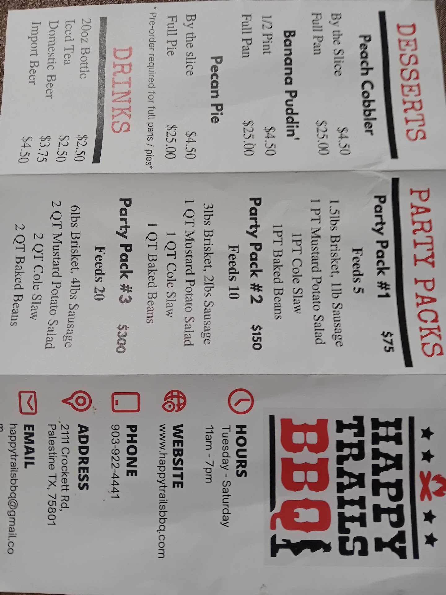 Ā Ā Ā Read moreHappy Trails BBQ: A Pit Stop Worth Making in Palestine Palestine, Texas, a town steeped in East Texas charm, offers more than just historic architecture and scenic train rides. Tucked conveniently near the southern edge of town, beckoning hungry travelers and locals alike, is Happy Trails BBQ. The promise is simple: good ol' Texas barbecue, served with a side of friendly hospitality. And for the most part, Happy Trails delivers. Stepping inside is like entering a comfortable embrace. The "rustic decor," as it's aptly described, leans into a familiar Texas aesthetic ā think weathered wood, perhaps a few vintage signs, creating an atmosphere that feels both casual and inviting. The dining room, notably clean and well-maintained, offers a respite from the Texas heat, a welcome oasis before or after exploring the Piney Woods. The staff mirrors this inviting atmosphere, greeting patrons with genuine smiles and an eagerness to please. For those in a true Texas hurry, the drive-thru window is a thoughtful addition, a pragmatic touch that acknowledges the demands of modern life without sacrificing the craving for slow-smoked meats. But let's get down to the heart of the matter: the barbecue. The brisket, that cornerstone of any respectable Texas joint, presented a compelling case. The smoky essence permeated each slice, a testament to hours spent over smoldering wood. The flavor profile was undeniably good, a satisfying depth that speaks to a well-honed rub and patient cooking. However, a touch more rendered fat, a whisper more unctuousness, would have elevated it from good to truly memorable. Still, itās a brisket that holds its own. The jalapeno sausage, on the other hand, was a delightful revelation. It struck that elusive balance ā a pleasant warmth that dances on the palate without ever becoming aggressive, perfectly complementing the savory pork and the bright, grassy notes of the pepper. This is a sausage that understands its purpose, delivering both flavor and a gentle kick in harmonious measure. The thoughtful offering of two distinct potato salads ā mustard-based and mayonnaise-based ā speaks volumes about catering to diverse preferences. Opting for the mayonnaise version, I found a creamy, well-seasoned rendition, a classic comfort that provided a cool counterpoint to the richness of the meats. The beans, often an afterthought, held their own, possessing a robust flavor that suggested they were more than just a sidekick. Overall, Happy Trails BBQ offers a solid and satisfying barbecue experience. While the brisket might benefit from a touch more moisture, the quality of the meats, the friendly service, and the convenient amenities make it a worthwhile stop in Palestine. It's not reinventing the Texas barbecue wheel, but it's certainly rolling along nicely, offering a dependable and enjoyable meal for those seeking a taste of authentic Lone...