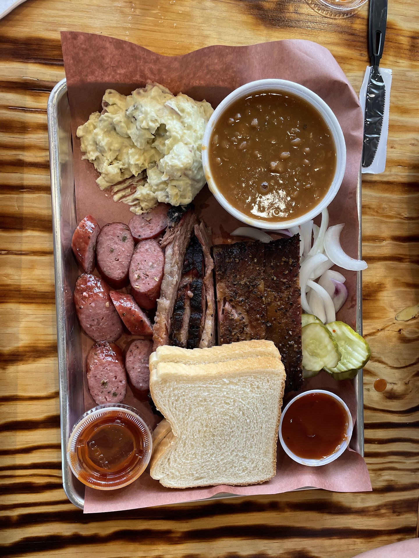 A reminder to not judge a book by its cover..... As we wandered through east Texas around lunch time, we found ourselves in the beautiful quaint town of Palestine. I was in the mood for barbecue but being so far out of any big city I didn't have my expectations set high for any place I might find. With limited options to choose from, I rolled the dice and just went with the one most convenient to our route. As we pulled up to the building, which was obviously an old 1980's Long John Silver's in a previous life, I started questioning my decision due to the lack of visible smoke and smokers but we were already committed. We walked into a dining area full of beautiful wood decor and furniture and to a staff of smiling faces but that alone wasn't enough to overcome my doubt in what was to come. My first evaluation of a barbecue restaurant starts with the brisket, turkey, and sausage and progresses from there to sides, sweet tea, desert, presentation, and the lastly atmosphere, so we went with the three meat plate of those three, a couple sides and the peach cobbler. As we sat and waited for them to put the plate together and we made ourselves comfortable I tried the sweet tea and decided they were off to a good start, not even having any other fountain drinks available, but my expectations were still not high for the meat. The plate got delivered to our table and was arranged in a symmetric and, for a lack of better words, pretty manner that I was not used to in bbq which as someone who is borderline OCD, I truly appreciated it but it ultimately led to more doubt in the barbecue because it was so different from every restaurant I've loved before. As I picked up the first piece of brisket, I realized immediately that I had judged the book by its cover and I did a poor job of it. The brisket was moist, tender and had an incredible bark. I dipped it in the light vinegar traditional ketchup based bbq sauce, put it in my mouth and was flooded by memories of all the best small town barbecue I've had in my life. The turkey and sausage brought upon the same feelings. Moving onto the sides, the beans were not your traditional ranch style pinto beans you find in Texas barbecue and were closer to a Bushes baked beans but guess what....I love Bushes baked beans too so we loved it. My child raved about the shells n' cheese, my wife hyped up the potato salad, and my mom went on to say that it was the best fried okra she's ever had. Safe to say the sides also passed the quality check. This place was exceeding expectations with every bite but now it was time for the peach cobbler, which, because of my grandma, I have very high and unreasonable standards for. They delivered the peach cobbler after we finished our food warm and on a walmart paper plate, which made me feel right at home. The look of the cobbler made me immediately think of my grandma's and the first bite transported me to sitting at my grandma's old dining room table surrounded by people I love finishing an incredible meal. It was incredible. All in all, the food and atmosphere were amazing but I can honestly say I don't know if I've ever had a dining experience that flooded me with so much emotion and love. This was truly food for my soul. Thank you so much for this experience...and maybe give more thought to installing a dinner bell at the exit with a sign that reads "ring bell if you were satisfied with your experience" like the old Long John Silver's as an homage to the history of the...