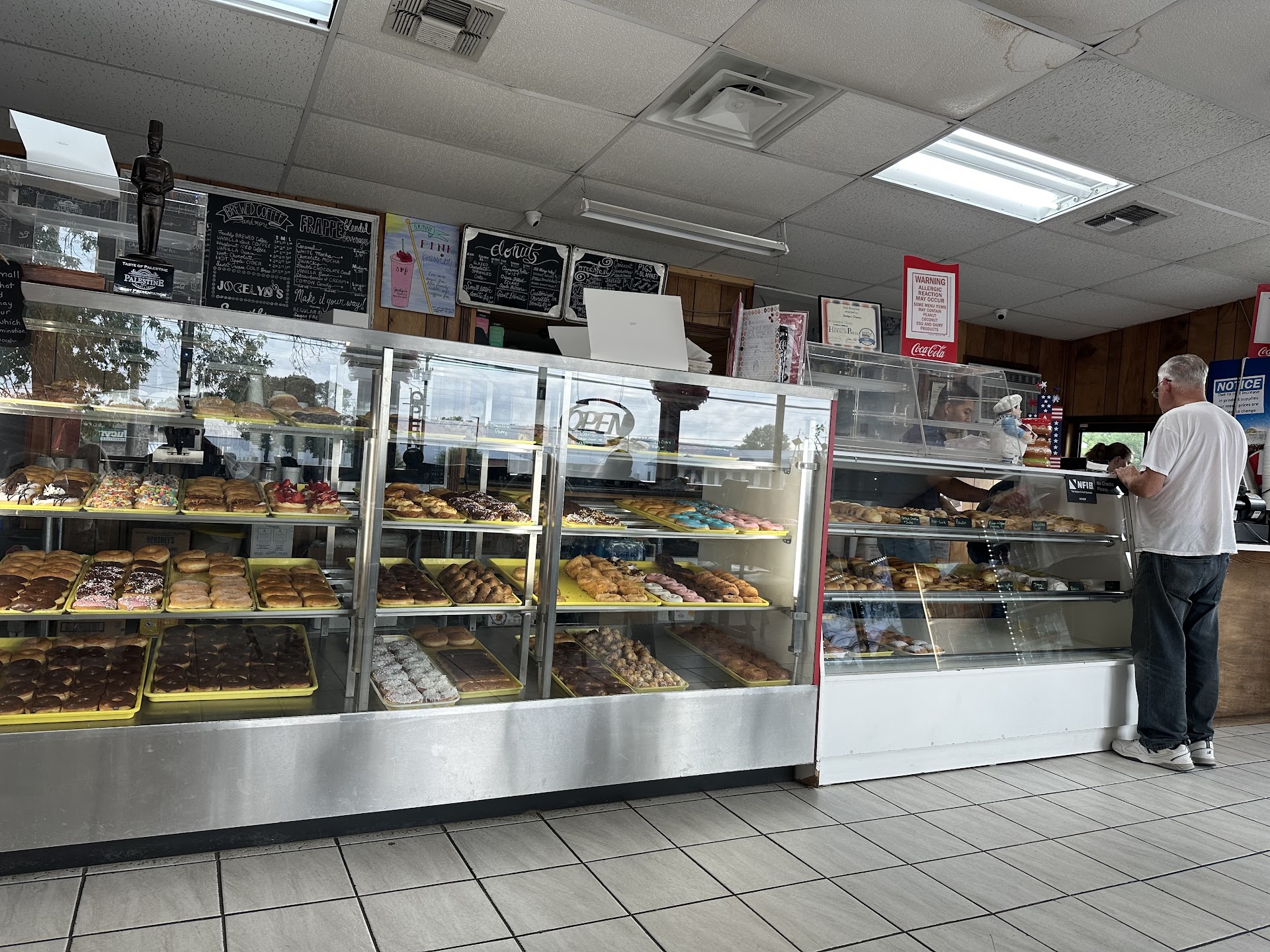 I would say Jocelyn's makes the best doughnuts in all of Palestine, as when you taste them, they have the lightest texture and they're not too doughy or too thick; they don't hit you like a brick when you eat them (doesn't matter which ones I've had, from glazed to cake or glazed/filled). You can tell how popular a spot they are just to check them out around 7-8 am each day, as there will be a line into the parking lot just to get the doughnuts and coffees here! I can also say that although I have a slight gluten sensitivity, this is the only place in town where I get the smallest reaction. That means that however they make their doughnuts, they make them fresh and with good quality ingredients.
