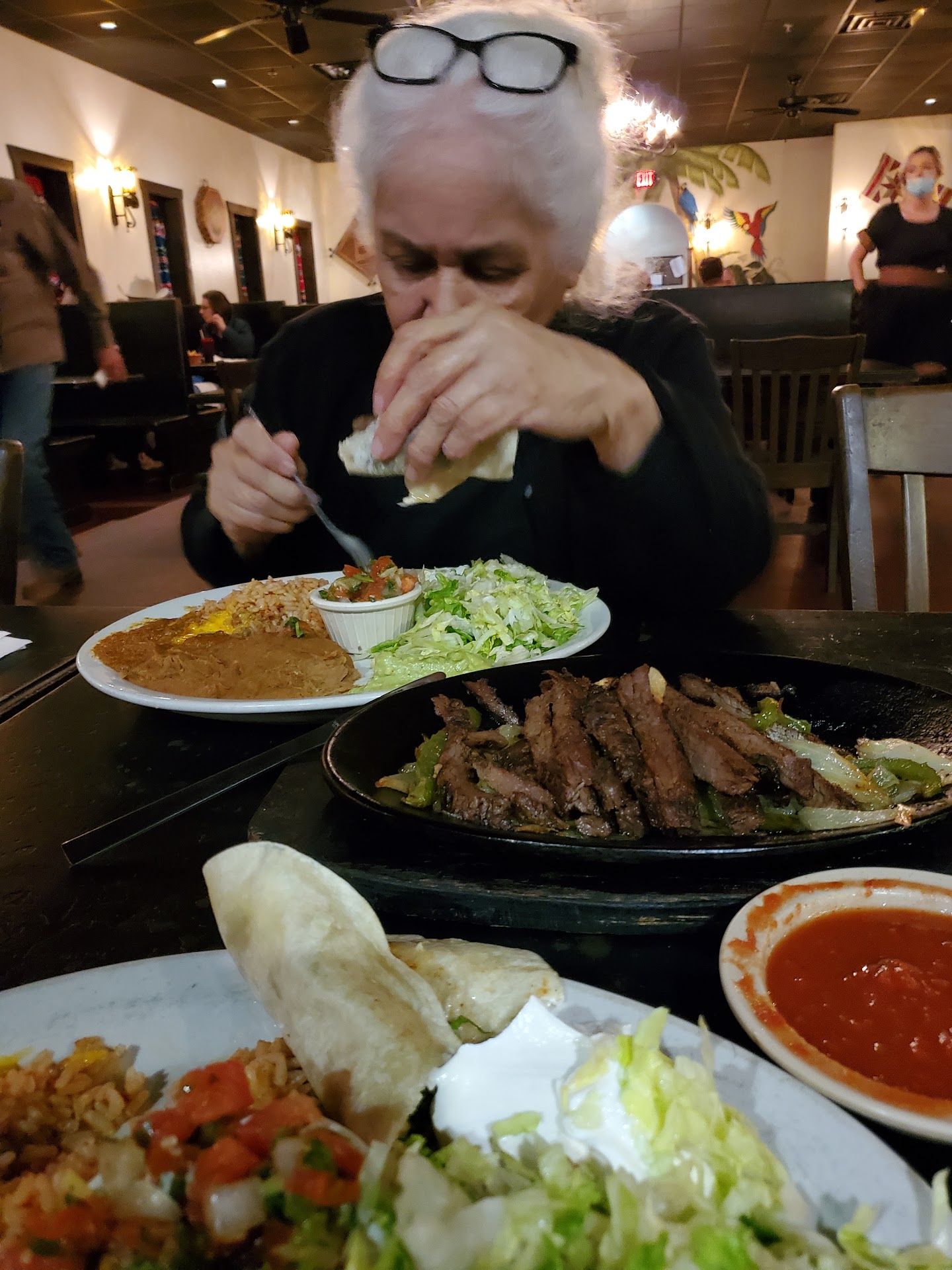 Amazingly 👏 this meal was more than enough for 2 because to each of us was given a full plate of all the trimmings and 5 tortillas per person. Clearly consideration was given when planning this meal. We left feeling full happy and had to take a to go box because we couldn't finish our fajitas. Although the waitresses weren't too chatty (which personally I like to get to know my waiter) they were very polite and never failed to enquire about our needs I hope to come here in a post covid crisis so the wait staff can have time to properly greet their customers but all things considered it wasn't their fault they were pressed for time and as far as I could see they were...
