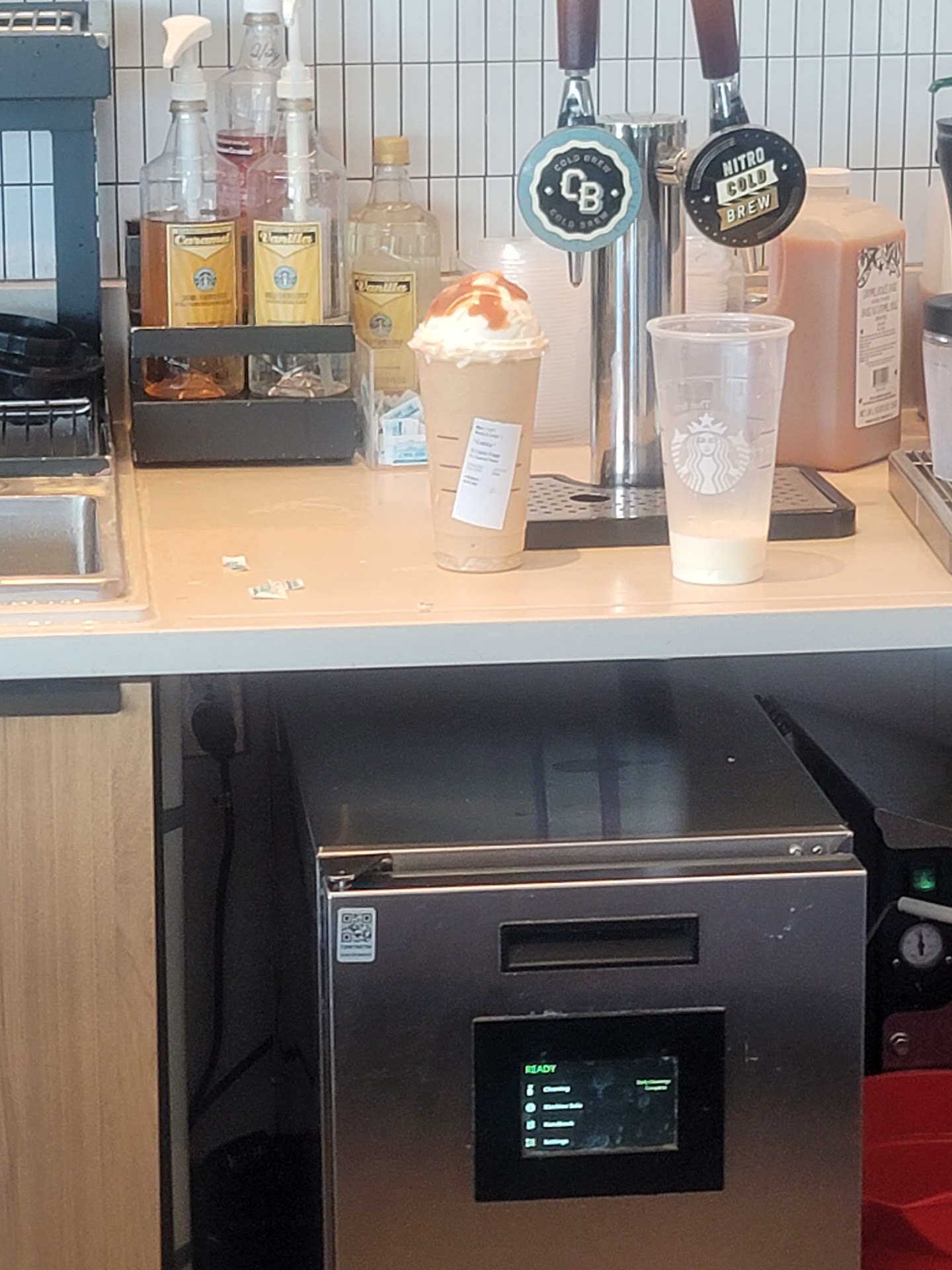 This is a very new location, so we've been cutting them some slack. Well, frankly, I'm DONE with that! I have a sensitive pallette. I order my decaf (I cannot have regular coffee due to medical reasons.) Cappuccino with only 1 shot with a specific number of pumps of classic simple syrup. Not a difficult order by any stretch of the imagination. The last 3 times they have messed it up and put 2 shots in it. It was too bitter...too disgusting to drink. I'm tired of wasting my money! I said something yesterday about how they keep messing up my order. They couldn't have cared less. The Cappuccino and the pink drinks are the only drinks I order for myself. It doesn't matter the time of day, 9 out of 10 times they do not even have the ingredients to make pink drinks! It's so frustrating to sit in line for 20 minutes only to find out you can't get what you came for! If management can't make sure their employees have the ingredients necessary to do their jobs, then maybe they aren't cut out for management. Other Starbucks we frequent will occasionally run out of something (usually seasonal items), but they generally have what they need to do daily operations. This store can't even keep basic things like cups and straws in stock, much less drink ingredients....