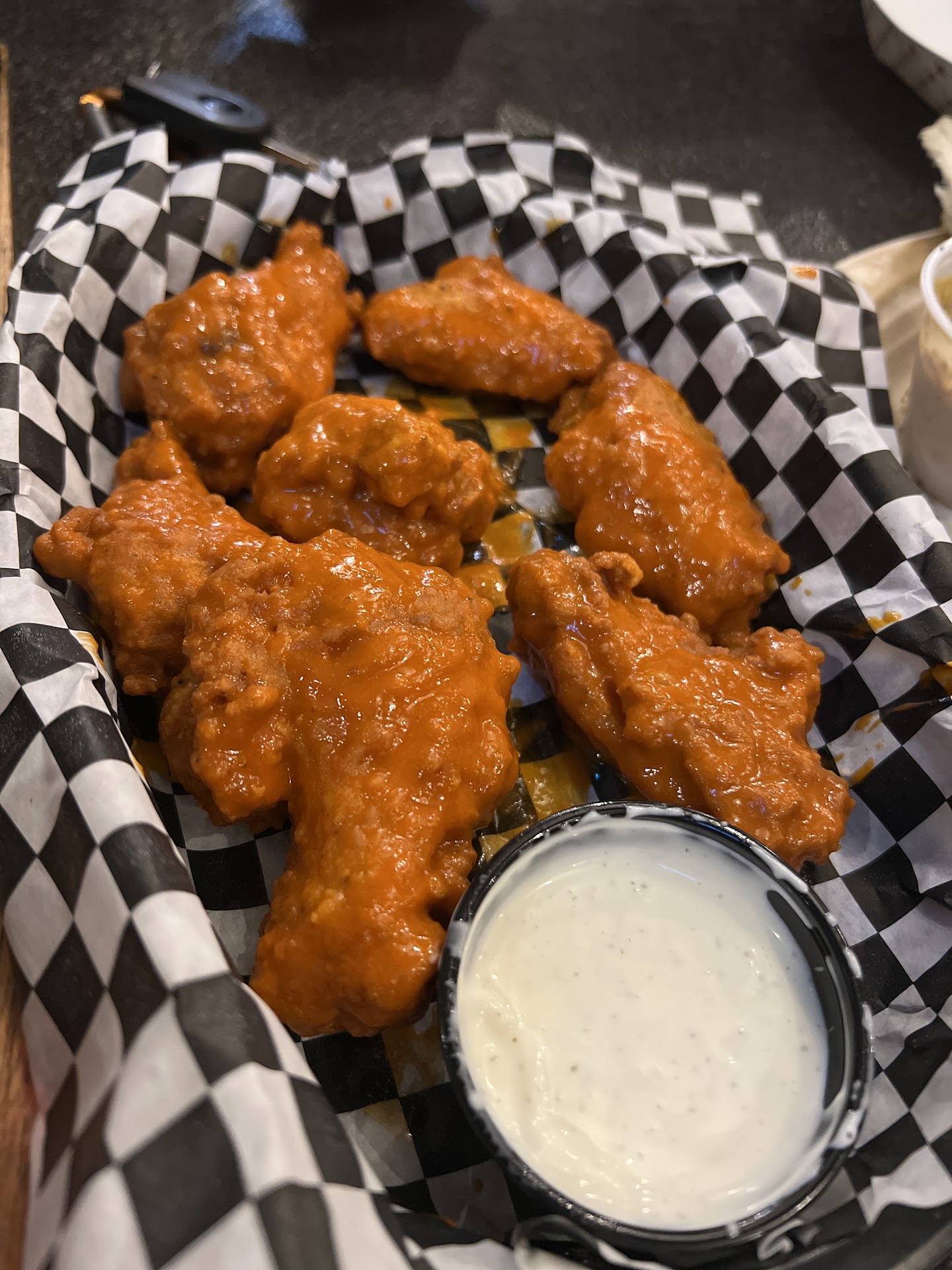 The food was a highlight—$1 wing night was a great deal, and the mild buffalo wings were pretty good. The grain pretzel with beer cheese was absolutely massive and delicious—highly recommended! The mustard that came with it was incredibly spicy and flavorful, adding a perfect kick.