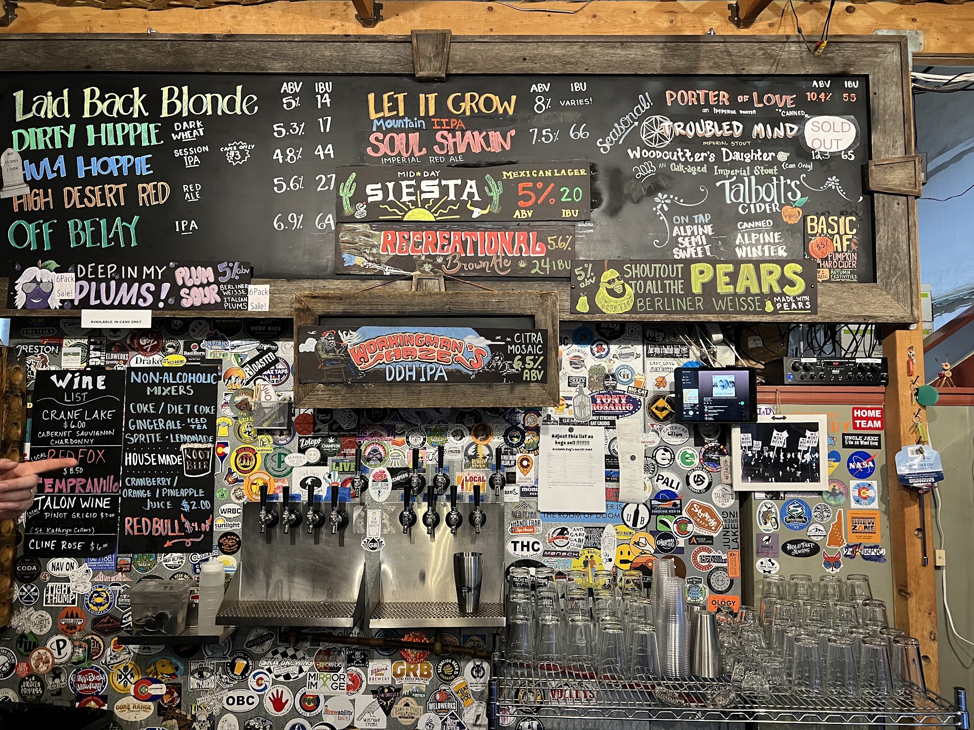 We visited Palisade Brewery on a Sunday and had a mixed experience. Our beer flight included the Forbidden Beet, High Desert, Laidback Blonde, and Dirty Hippie. The Forbidden Beet was earthy and unique, the High Desert was watery and underwhelming, but both the Blonde and Hippie were enjoyable.