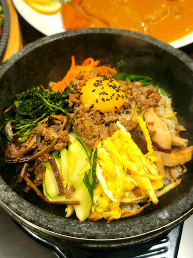 Everyone was asking about their cold noodles but they told us that the noodle machine had not arrived yet so that was not available yet. We ordered some other items instead. The seafood pancake was huge and thicc! It had a nice crispy crust and soft inside with plenty of octopus. We couldn't finish and ended up taking the rest home. The donkatsu was ok. It was flatter and harder than what I am used to. The little side pasta salad and cabbage that came with it was better imo. The LA kalbi was flavorful but kind of chewy. I liked the hot stone pot bibimbap but we had to wait while we tried to get someone to give us some red pepper sauce because they forgot.