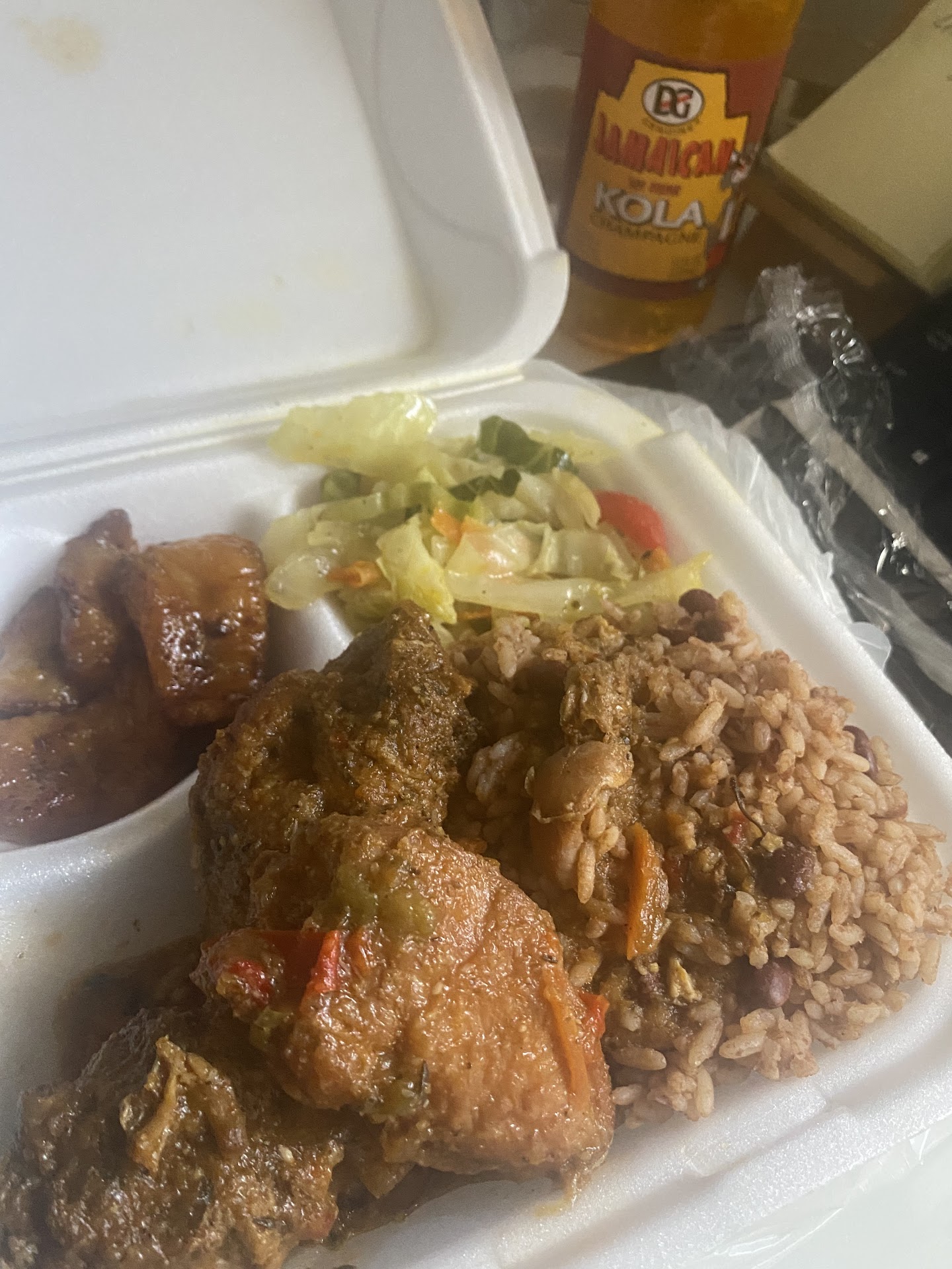 Read moreWhen I first walked in it was no people in there besides two of the workers The problem I had was when I walked up he greeted me nicely but the food didn't have really good quality I ordered fried chicken and the chicken was at least two long out or overcooked or it was just fried halfway it was hard to explain how it looked then he put sauce on top of fried chicken you never put sauce on top of fried chicken because the fried chicken of itself the crunchiness would get soggy The rice was not okay as well as the cabbage was definitely not good The only thing that was okay was the plantains I really hope that they will get better with their fried chicken because this Jamaican. Jamaican food is not Jamaican food there's...