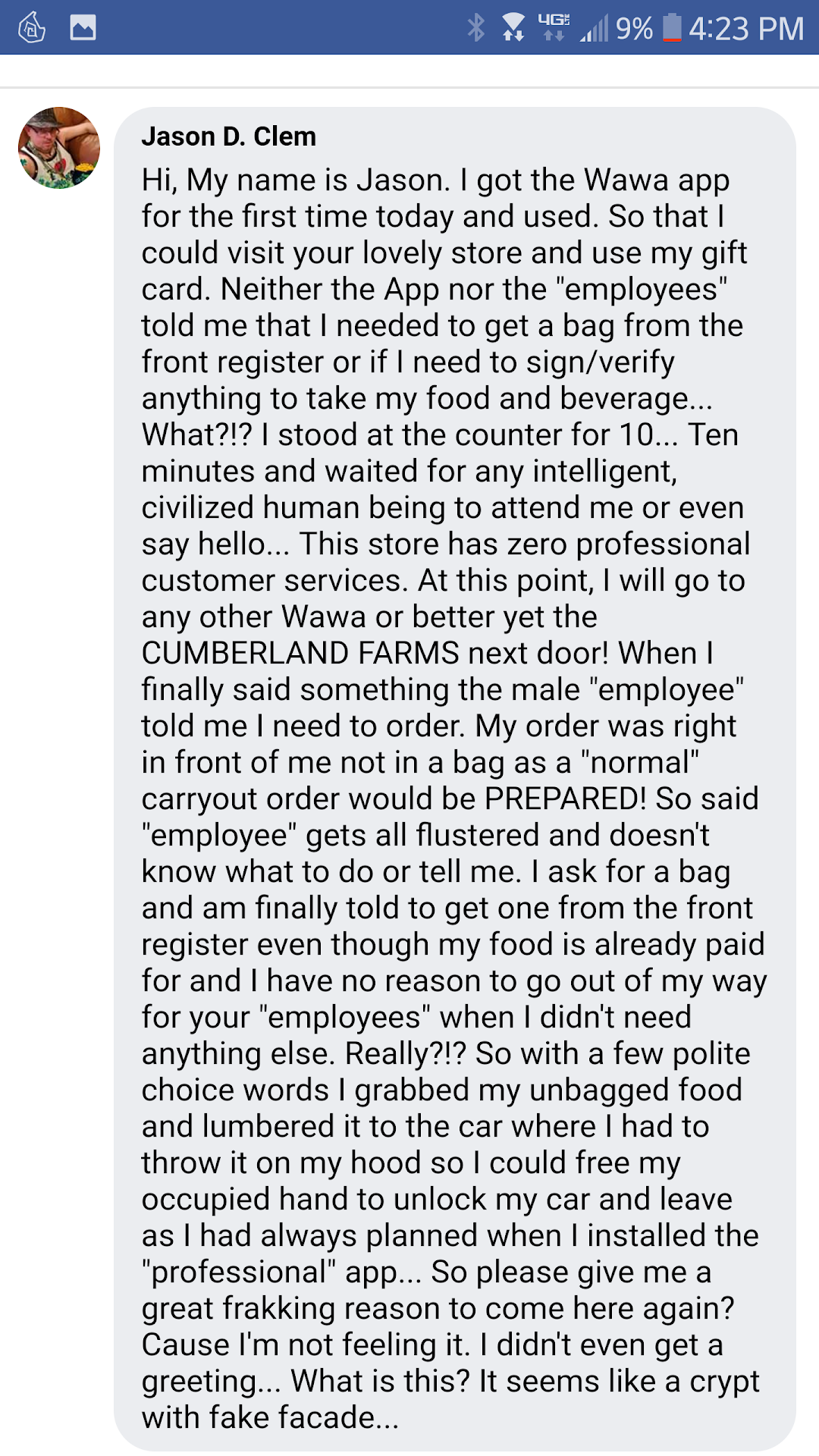 Read moreHi, My name is Jason. I got the Wawa app for the first time today and used. So that I could visit your lovely store and use my gift card. Neither the App nor the "employees" told me that I needed to get a bad from the front register or if I need to sign/verify anything to take my food and beverage... What?!? I stood at the counter for 10... Ten minutes and waited for any intelligent, civilized human being to attend me or even say hello... This store has zero professional customer services. At this point, I will go to any other Wawa or better yet the CUMBERLAND FARMS next door! When I finally said something the male "employee" told me I need to order. My order was right in front of me not in a bag as a "normal" carryout order would be PREPARED! So said "employee" gets all flustered and doesn't know what to do or tell me. I ask for a bag and am finally told to get one from the front register even though my food is already paid for and I have no reason to go out of my way for your "employees" when I didn't need anything else. Really?!? So with a few polite choice words I grabbed my unbagged food and lumbered it to the car where I had to throw it on my hood so I could free my occupied hand to unlock my car and leave as I had always planned when I installed the "professional" app... So please give me a great frakking reason to come here again? Cause I'm not feeling it. I didn't even get a greeting... What is this? It seems like a crypt with...