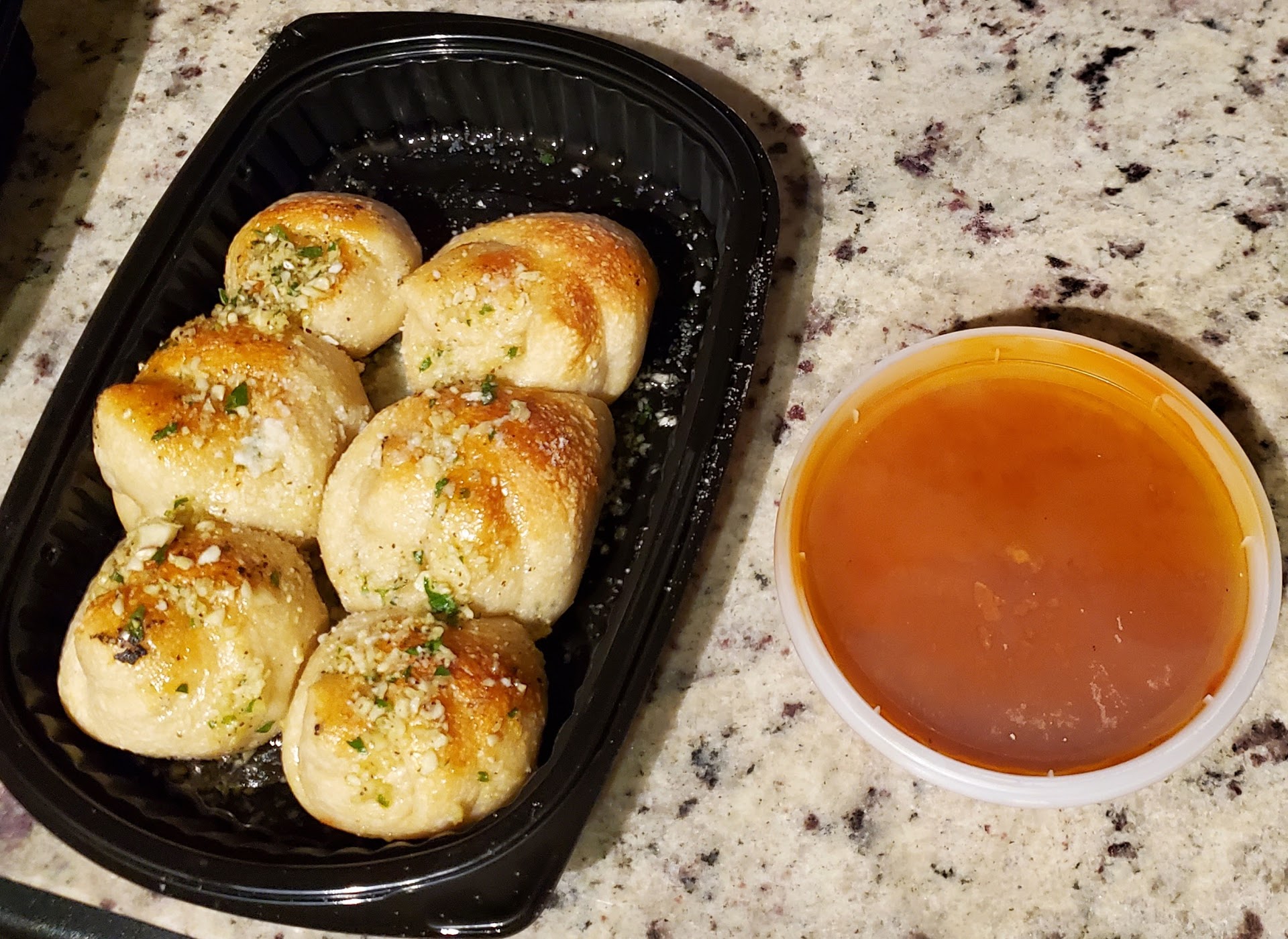 My family often opts for a meal deal that includes a large salad and one-topping pie. The salad is huge, allowing for two to have ample salads or four to have small ones! It's dressed with olives, garbanzo beans, eggs, wedged tomatoes and other goodies atop fresh romaine. For the 16" pizza I've found that the perfect topping is the thick-cut, cup pepperoni that provides a spicy kick with a meaty chew. Oh, and don't forget an order of flavorful garlic knots to satisfy your carby-cravings. đ