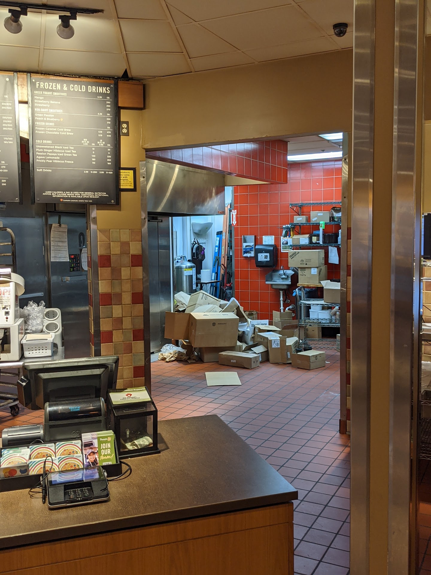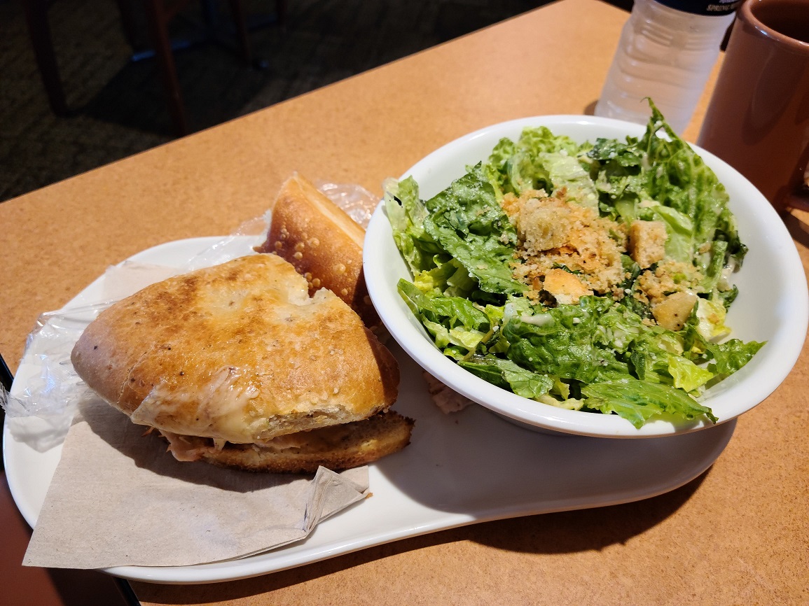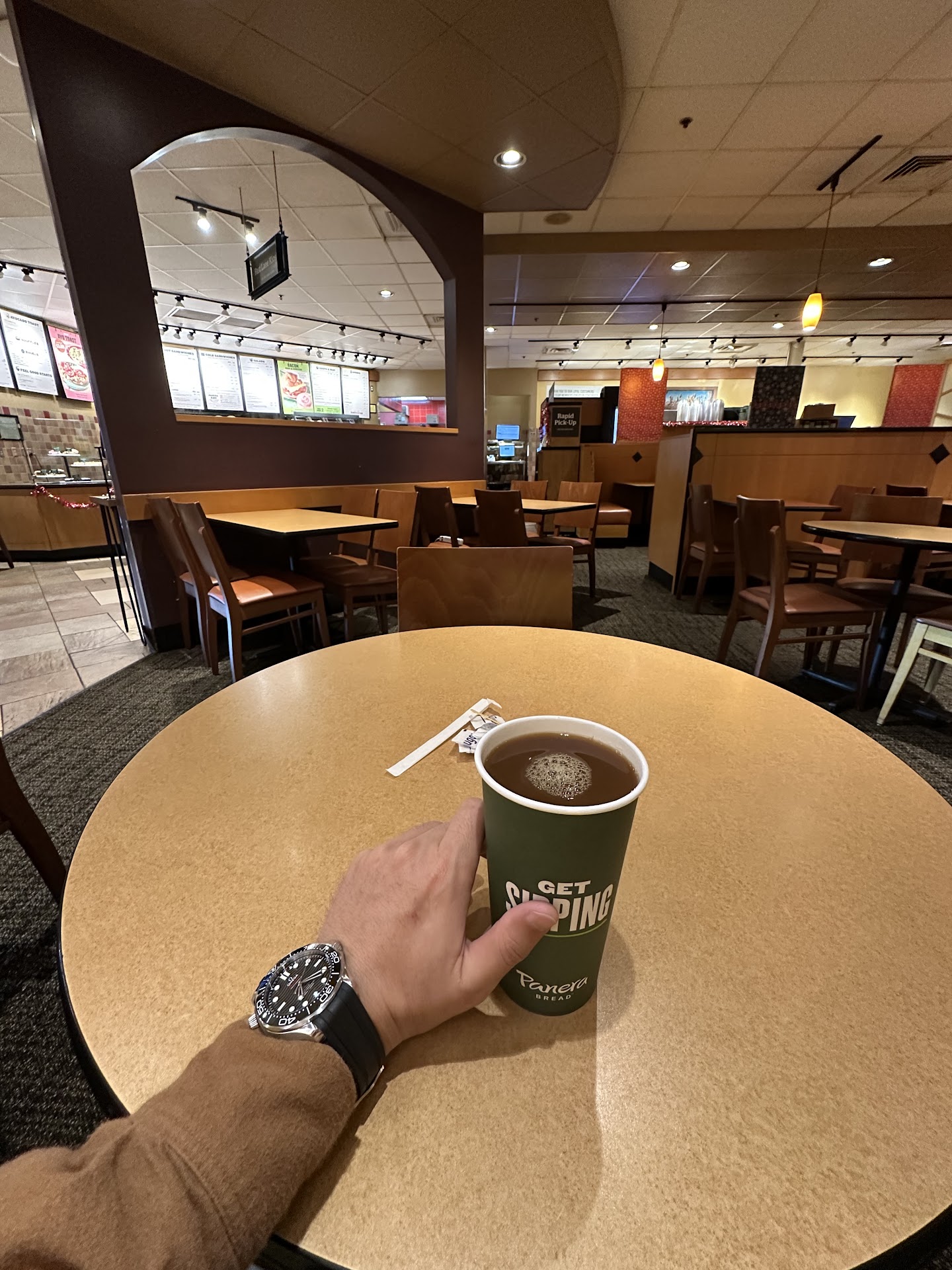 Ā Ā Ā Read moreI give the following review both as someone who prefers not to make waves and also as someone who has NEVER had a bad experience at a Panera before. When I first came in, one of the guys on the floor immediately greeted me in a friendly manner. Great start. But then the cash registers were initially unmanned. Eventually a young man came over and started wiping up one of the registers without saying anything. I waited for him to be ready. He called me over. I started to give my order; but he continued to wipe the register without looking at me. I stopped. He finally entered part of my order and asked me to repeat the first part. Asked if it was all for here or to go while I was still ordering. By then a young woman has come over and is standing at the next register just staring at him in a bored and hostile manner. He asks her to get my baked good and she does, come back, thrusts it aggressively in my direction without looking at me. As soon as he hands me my receipt, I thank him and he takes off without a word or a look. I hadn't gotten a buzzer or a cup for my hot tea. I think, maybe they do it differently here? So I ask her about it. She glances at me in irritation, asks what I ordered. She looks away and thrusts a cup at me in the same aggressive manner, no eye contact. No word on the buzzer. While I wait I look at the floor. Covered in crumbs. It is only noon; I doubt they sweep at night. When I hear my name called out and go to the counter for my food, the girl here actually smiles, makes eye contact, says you're welcome. I'm thankful for the common decency. I get back to the table and find my sandwich has been slopped together. Half a cup of mayo on it and pouring off both sides. The turkey is in a ball and really does look like someone may have pre-chewed it. It falls apart a bit more each time I pick it up. I eat a decent amount of it with my soup spoon. Soup is really good at least. At one point I see a woman go to the pass-through about a mistake with her order. 3 people behind the bar stop what they are doing to stare hard at her until she is helped. All of the staring here really makes me feel like there is some sort of pod-people situation going on. While I am eating, I see the same guy on the floor. Really hustling to clean tables, smile, check on people, and perform small acts of extra kindness like clearing the dishes for the young woman who has finished eating but is still engrossed in her medical text. This man, the girl at the pass-through, the tea selection, and the soup are the only reasons this place gets a...