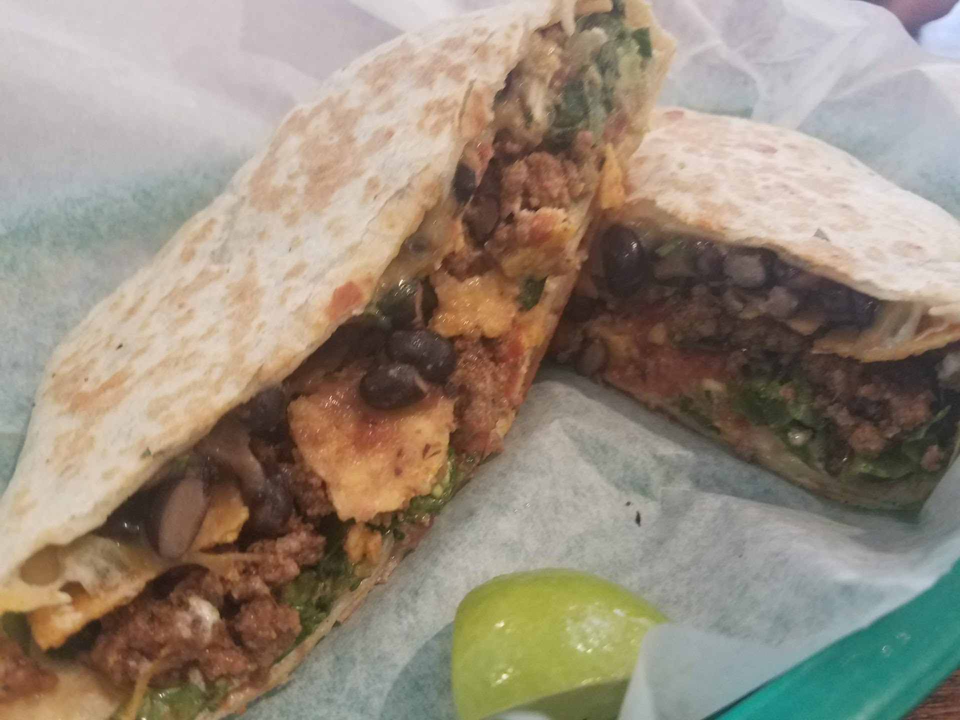 Maybe I should have opened it up & inspected it before eating it, or watched the kid making it more closely, but I really couldn't detect ANY guacamole in it (& didn't see ANY leaking, or visible after inspecting it periodically after bites) & if there was more than half a teaspoon of sour cream in there, I'd be shocked.