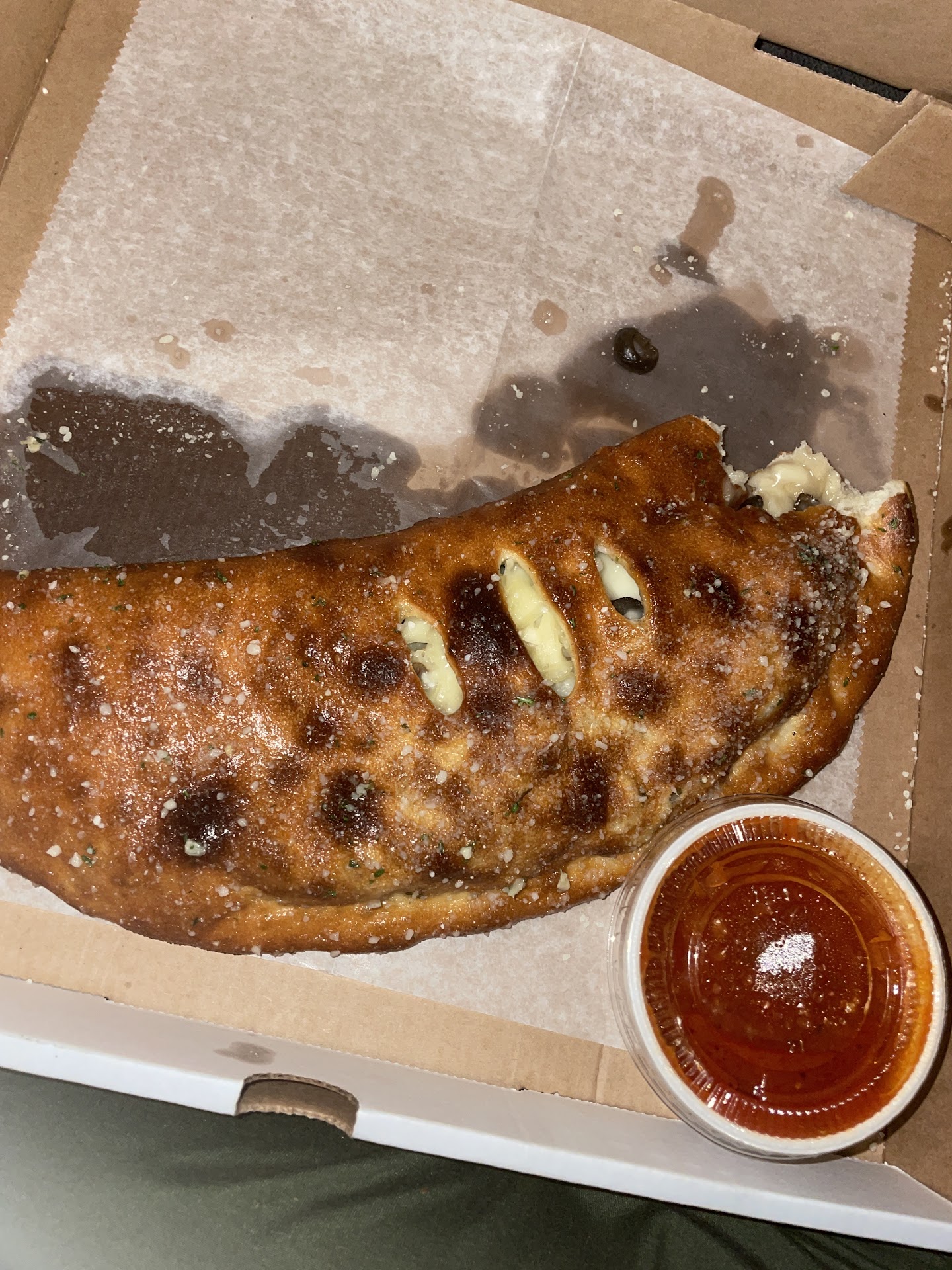 Edit to respond: it was not half eaten, it was cut once and my mom couldn’t chew it because it was so hard from being over cooked (the edges were black), we’ve had plenty of calzones and never had a place had to cook it to where it’s hard and black, so how about you don’t lie on a review response to try to make yourself look better!