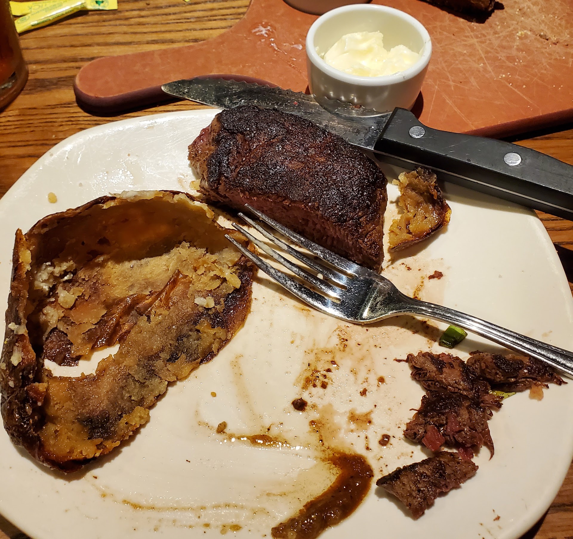 This was my first & only meal of the day, yet after eating the potato, drinking one tea, plus eating 1/4 of the dessert, I couldn't eat more & had to bring the steak home!